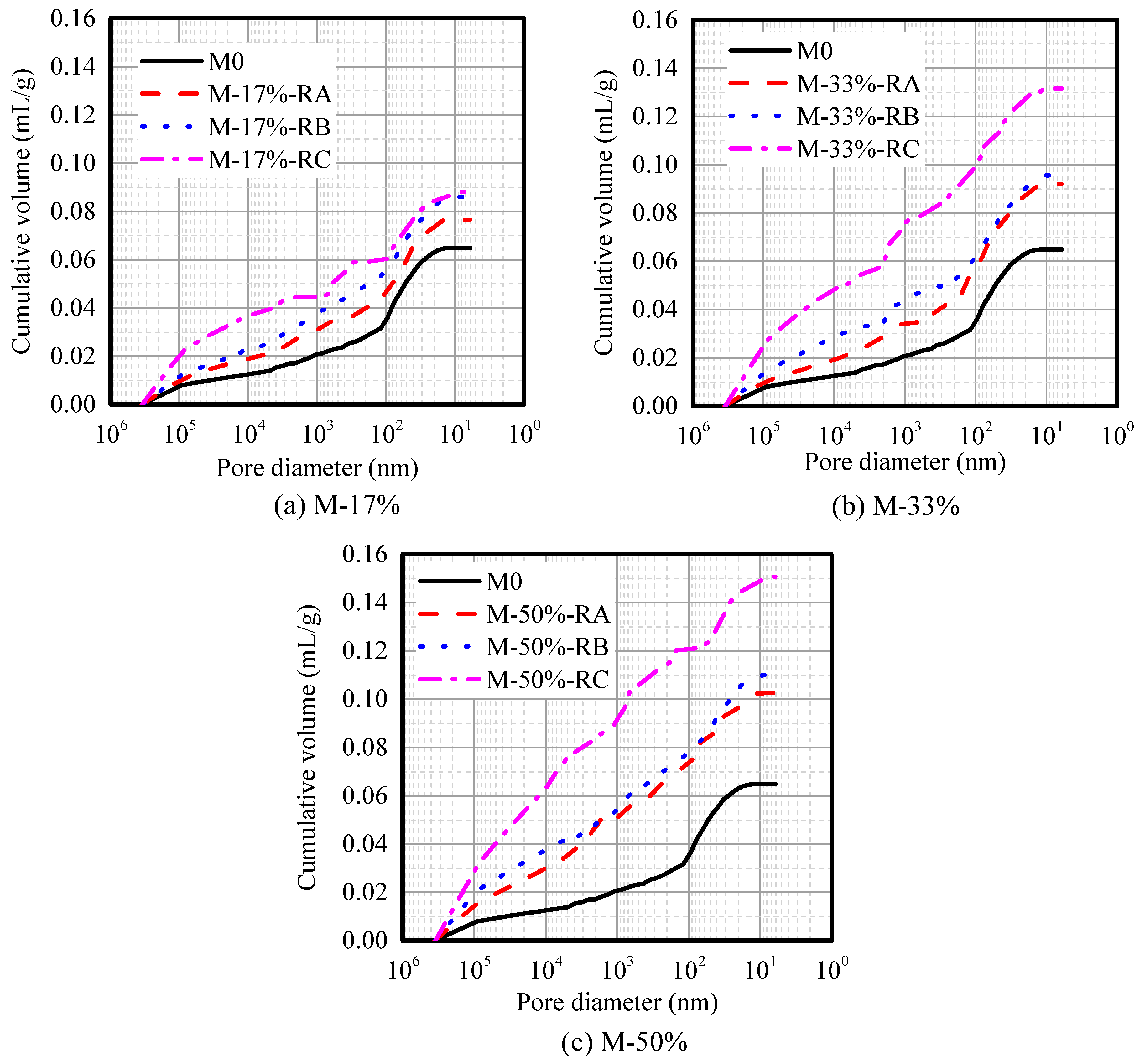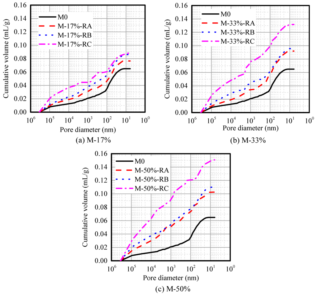Figure 7 shows the pore size distribution for rubberized mortars with different rubber sizes and contents. Table 4 presents the total pore and mesopore (<50 nm) volumes of CRMs. Figure 7 shows that the cumulative volume increases with the rubber content or decrease of the rubber size, and the influences of Rubber C on the pore volume of CRM is very significant. With the smallest size and largest content of rubber, the cumulative porosity volume of sample M-50%-RC is the largest, which is 2.32 times that of the plain mortar M0. Mesopore is a pore <50 nm, which is directly related to the drying shrinkage. Table 4 shows that the mesopore volume also increases with an increase in the rubber content. However, in terms of rubber size, especially at rubber cement ratios of 17% and 33%, the mesopore volumes of CRM showed slight difference. On the basis of the above analyses, we conclude that both the rubber content and size influence the pore volume, but the mesopore volume is mostly affected by the rubber content.