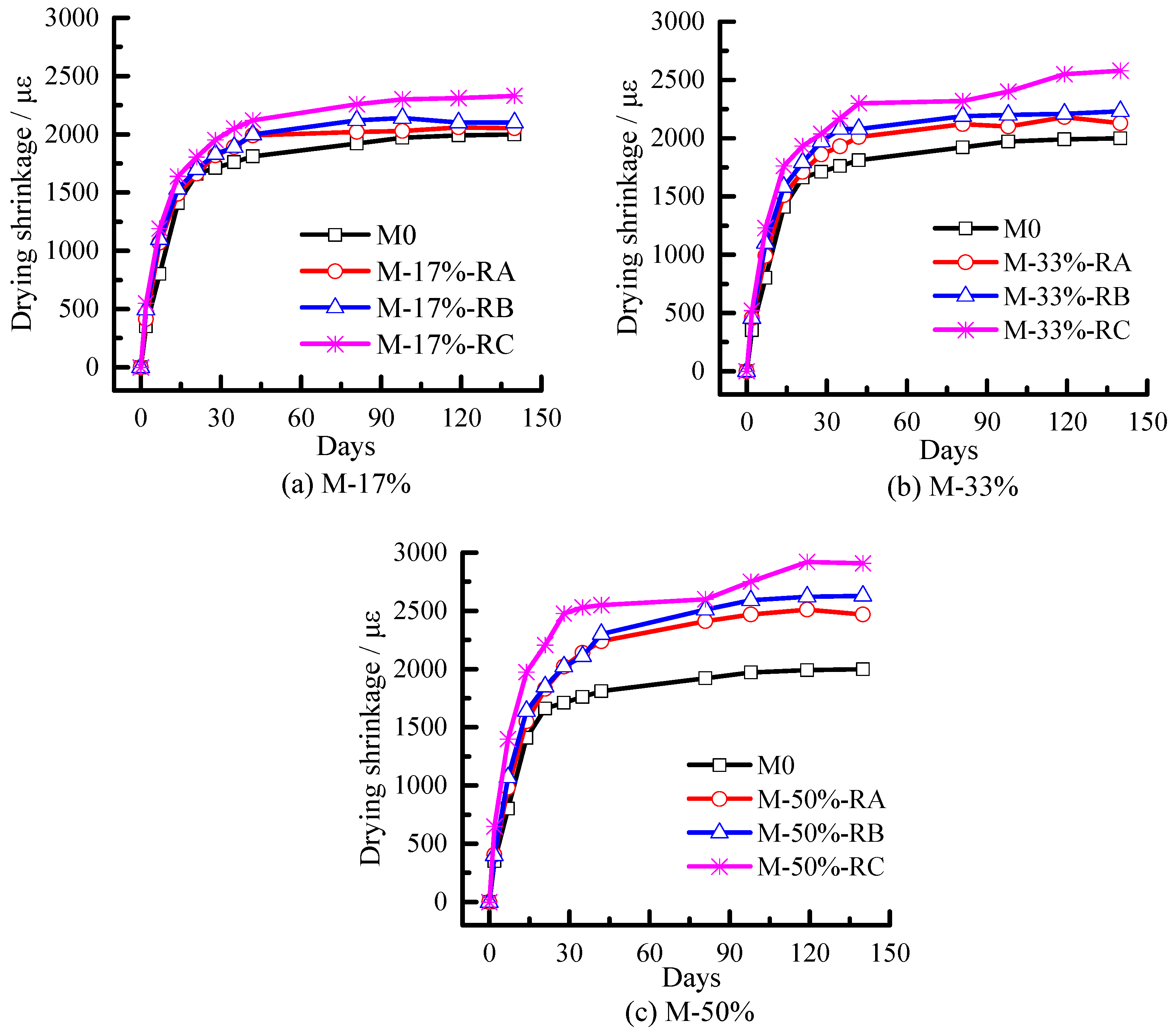 The drying shrinkage of mortar is plotted versus the mass loss in Figure 10a–c. The drying shrinkage increased with the water evaporation until a certain age (about day 100), as expected. Figure 10a–c show that with the same mass loss the drying shrinkage of mortars with Rubber C is the largest, followed by mortars with Rubber B and Rubber A.