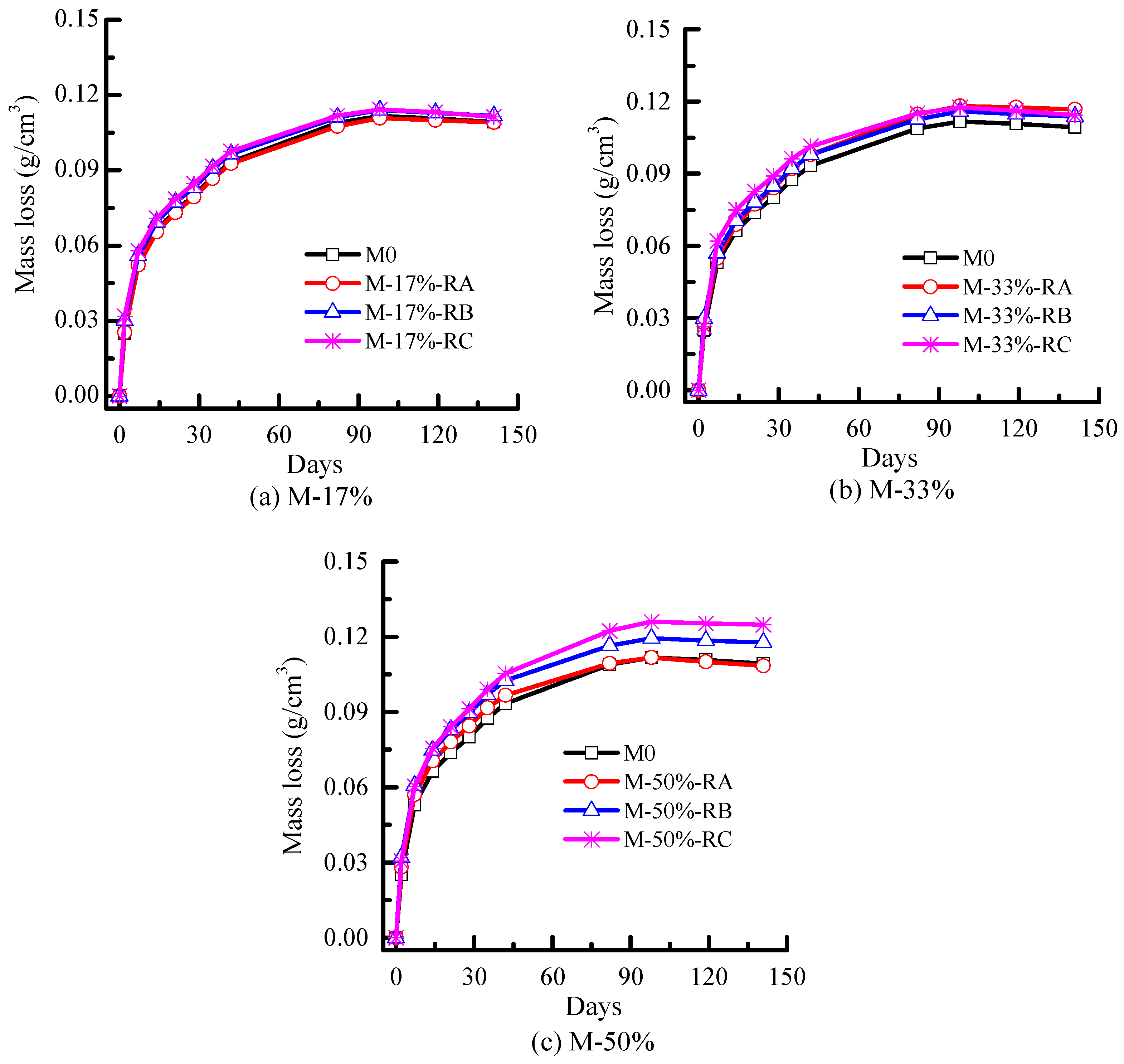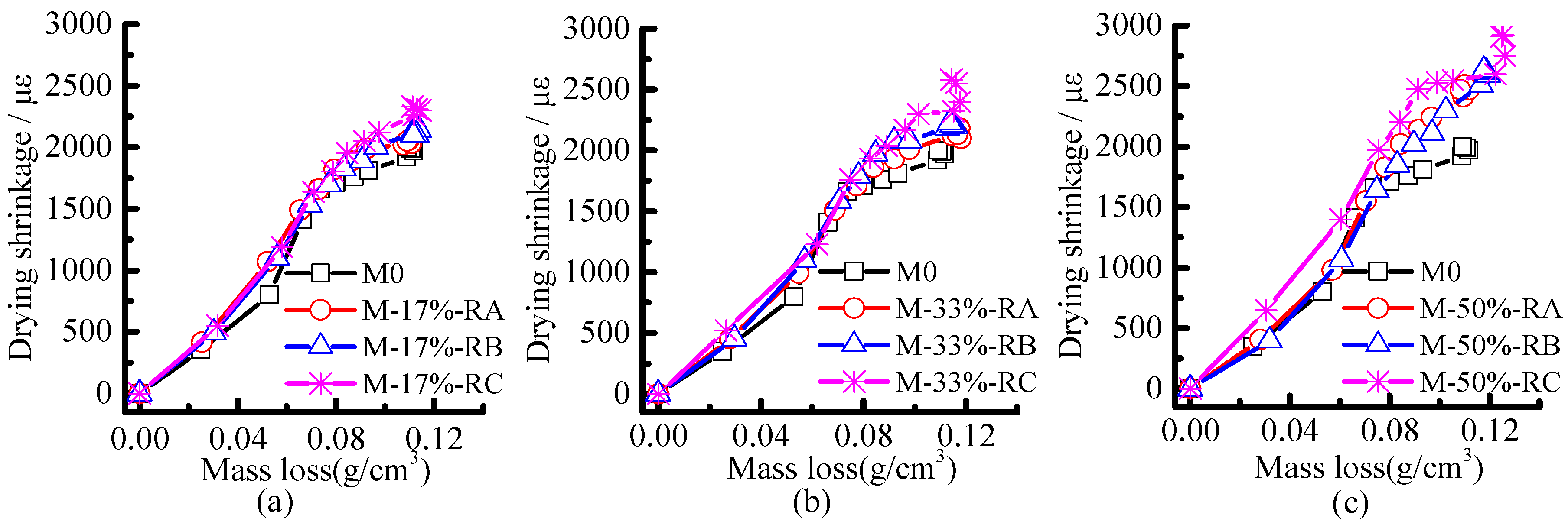 Relationship between mass loss and drying shrinkage of rubberized mortars, (a) M-17%; (b) M-33%; (c) M-50%.