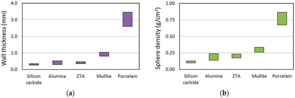 The performance specifications of buoyancy modules require (a) high sphere compressive burst strength; (b) low density; (c) high hydrostatic creep resistance; (d) zero water absorption; (e) temperature/chemical stability when setting in syntactic foam resistance during syntactic foam manufacturing (~150 °C) and (f) feasibility for high volume productions. Although ceramic materials are brittle, they exhibit particularly high compressive strength and stiffness in comparison with metals and polymers [13,14]. The creep deformation in ceramics generally becomes noticeable at high temperature, usually >40%–50% of the melting point. In our application, the concerns of hydrostatic creep in the ceramic sphere are rather negligible, as the working temperature is below the ambient temperature [15]. On the other hand, an advantage of using ceramic spheres is their temperature resistance, usually up to 1000 °C; it allows easy handling when adding a syntactic epoxy foam mixture to the hollow spheres in the production of the buoyancy modules, which results in an exothermic reaction up to 200 °C. Moreover, the density of our sintered ceramics is above 98% of the theoretical material density; therefore, no pores exist, which is largely determined by the quality of the raw materials and the forming techniques, showing very good hermeticity against sea water. Overall, both compressive burst strength and buoyancy properties are considered to be the most critical criteria for the ceramic sphere in the determination of the ceramic material choice as well as geometric design.