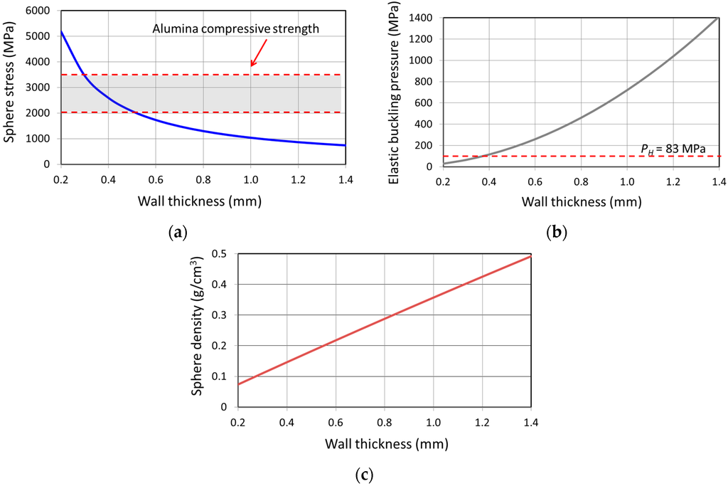 (a) calculated sphere stress at 83 MPa of hydraulic pressure; (b) elastic buckling pressure of the sphere walls and (c) sphere density for the alumina-based ceramic spheres made of alumina materials with various wall thicknesses.