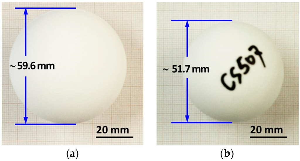 Comparing the dimension of the green and sintered spheres (see Figure 4), it was observed that the sphere dimensional shrinkage is much smaller than the sphere wall shrinkage. This shrinkage difference is very likely caused by the thin-wall hollow spherical shape; the densification of alumina that shrank from both outer and inner surfaces to each other during sintering might hinder the sphere shrinking from its outer radius. Nevertheless, more details of this shrinkage difference in hollow shaped ceramic objects will be investigated in our future work.