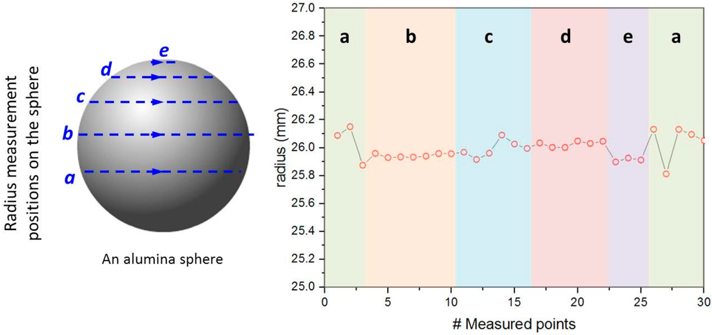 The radii results measured on a CS T10 ceramic sphere’s surface are presented in Figure 5, in which the measured points are indicated as circular dotted lines in blue. The ceramic sphere has an average radius of 26.00 mm with a standard deviation of 0.10 mm: