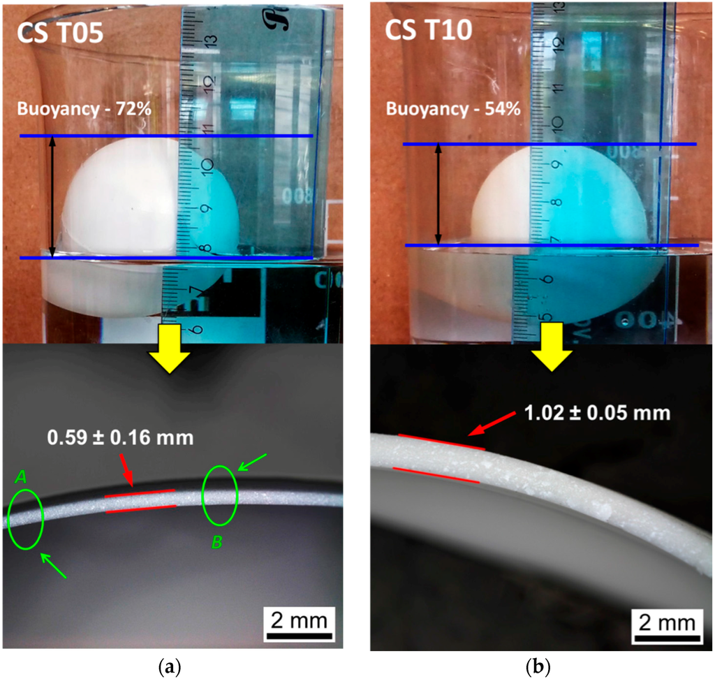 Figure 6 shows two types of fabricated samples, labeled as CS T05 and CS T10, which are tested in simulated sea water for their buoyancy properties. All spheres were floating in the water with more than 50% of their volume above the water. The results demonstrate that these alumina based ceramic spheres have very promising buoyancy performance. For example, as calculated by Equation (4), the CS T05 with a wall thickness of 0.59 ± 0.16 mm achieved a buoyancy factor B of 72% (see Figure 6a), while the corresponding sphere density was about 0.47 g/cm3 as calculated by Equation (2). The wall thickness indicated in the figure was measured at the cross-section of the fractured sample. The obtained deviation reveals the high level of uniformity of the wall thickness in the samples, which is critical to the mechanical performance of the ceramic sphere [23].