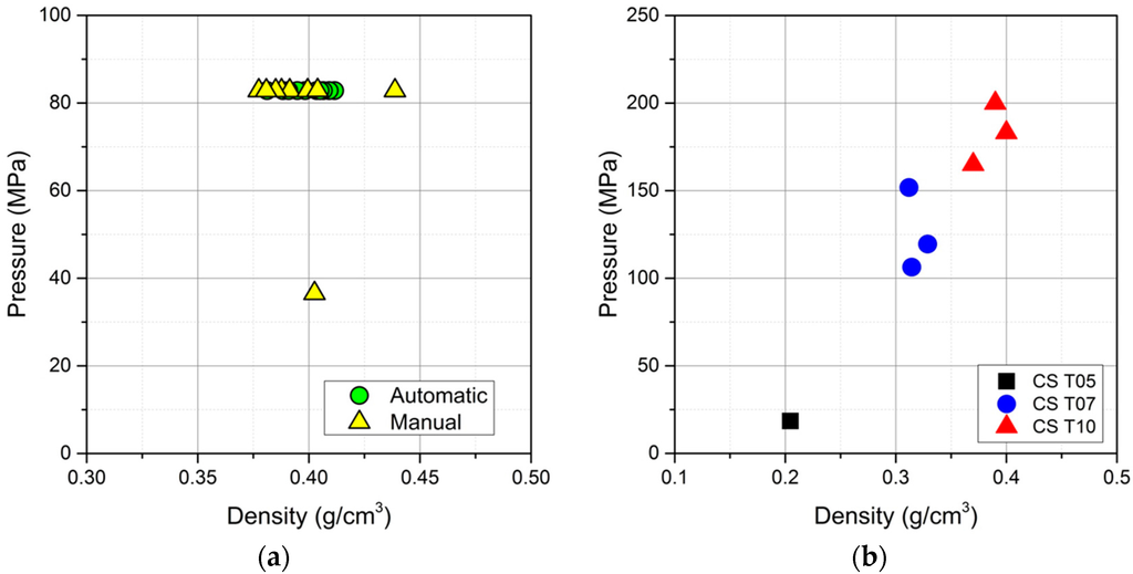 Moreover, samples with various wall thicknesses have been evaluated with regard to their hydraulic failure pressure. Although the number of tested samples is limited for a statistical observation, the authors still believe that these results can serve as preliminary information for comparison purposes with other hollow sphere products. As shown in Figure 7b, the CS T10 achieved 182.7 ± 14.3 MPa of average failure pressure, while the CS T07 achieved 125.9 ± 19.1 MPa.