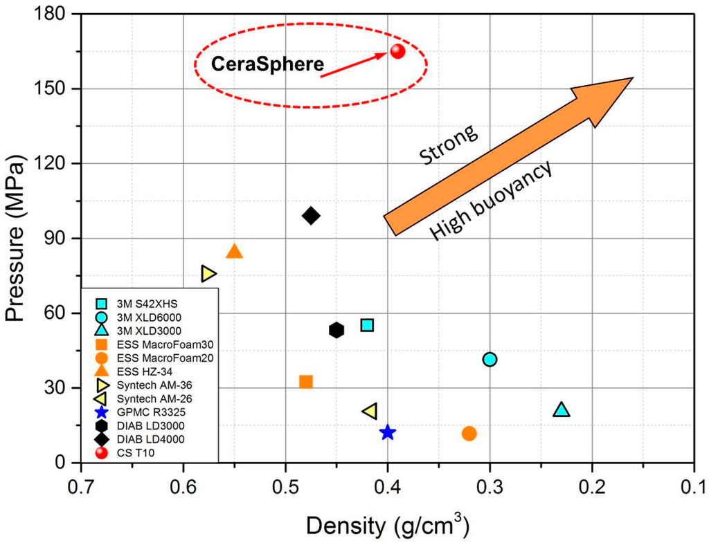 A benchmark comparison of the ceramic sphere and other commercial buoyancy products in terms of hydrostatic compressive burst strength and density [24,25,26,27,28,29].