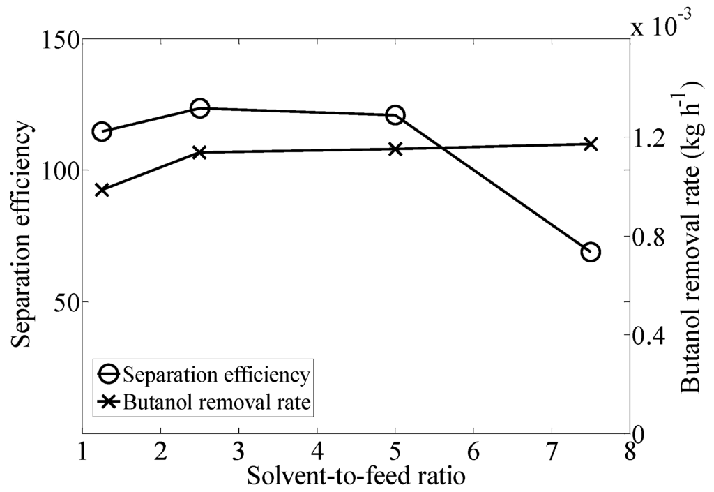 Effect of solvent-to-feed ratio on separation efficiency and butanol removal rate (kg·h−1) at constant pressure (10.34 MPa) and temperature (25 °C).