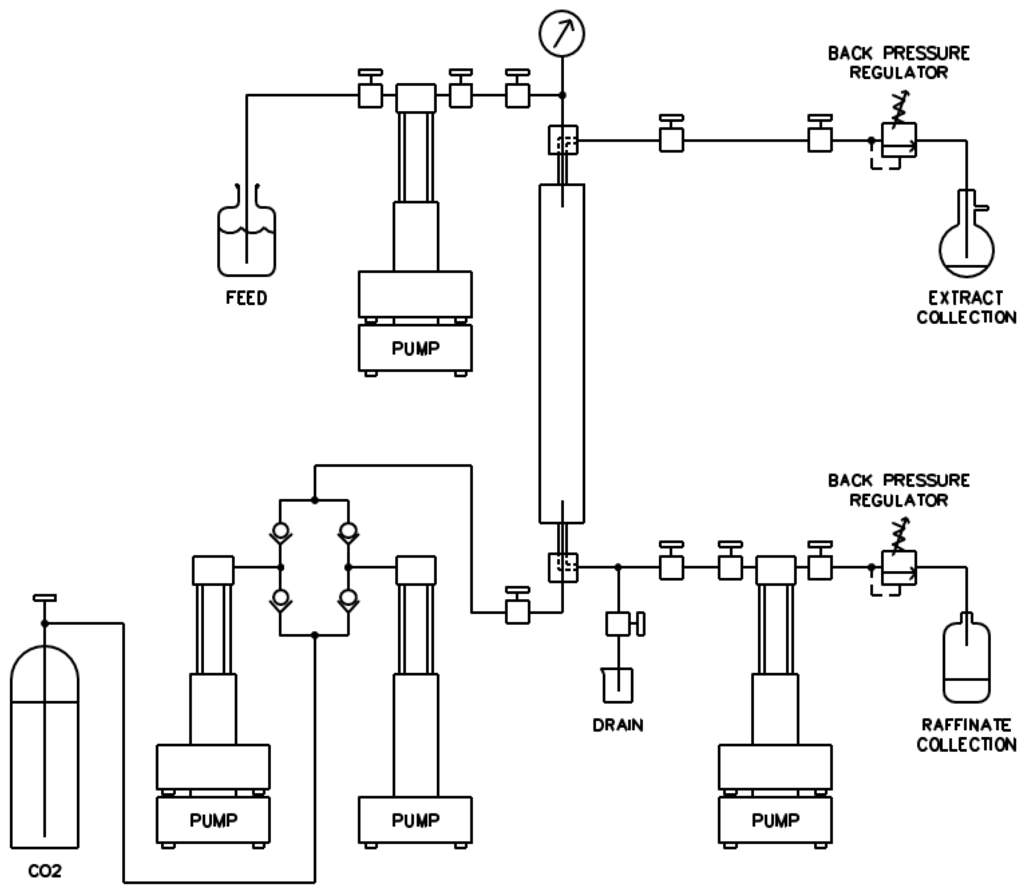 The basic design of the counter-current fractionation laboratory scale unit has been described elsewhere [,]. In this work, the gas booster pump was substituted by a syringe pump. The column was packed with seventy six vertically-stacked packing Pall Ring pieces, 316-stainless steel, of 0.016 m diameter (AMACS Process Tower Internals, Houston, TX, USA). A schematic of the complete apparatus used for this study is shown in Figure 5.