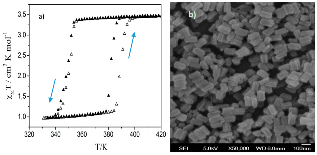 Figure 1a presents the spin transition curve of 1 obtained from magnetic susceptibility measurements during the first two thermal cycles. The LS-to-HS transition occurs around 387 K (382 K) during the first (second) heating while the reverse transition occurs around 348 K on cooling in both cycles. SEM images of the as-synthesized sample (Figure 1b) reveal sub-micrometric platelet-like particles, which seem to be composed of several tightly aggregated rod-shaped crystallites, which are aligned along their axes. These images closely resemble those reported by Grosjean et al. [11,12]. Based on their PXRD data, these authors identified the rod-shaped crystallites as coherent domains of 1. On this basis a parallel between the long axis of the particles and the b unit-cell parameter was also established.