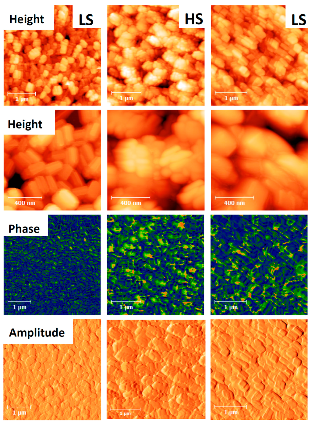 Surprisingly, the quantitative analysis of the AFM phase signal did not reveal a significant change on the spin transition. In the HS state, the average phase angle shift is very similar to that in the LS state (14.4° vs. 14.9°) at the same temperature. This result is somewhat surprising as the surface stiffness of the particles in the HS phase is expected to be significantly lower, which should be reflected by the phase images [20]. However, the cross-talk between the topography changes and the phase signal may hide the effect related to the variation of the sample visocoelastic properties [26]. This issue will require further studies using quantitative nanomechanical techniques.