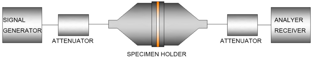 Based on the ASTM D 4935-99 “Standard Test Method for Measuring the Electromagnetic Shielding Effectiveness of Planar Materials”, the EMI SE measurement system was utilized (a flange coaxial transmission line testing device developed by the Southeast University, Nanjing, China). The measured frequency ranged from 30 MHz to 1.5 GHz. The experimental components and connection of the device are shown in Figure 1.