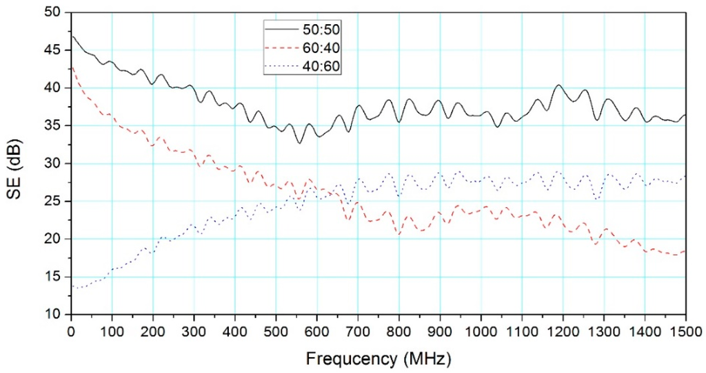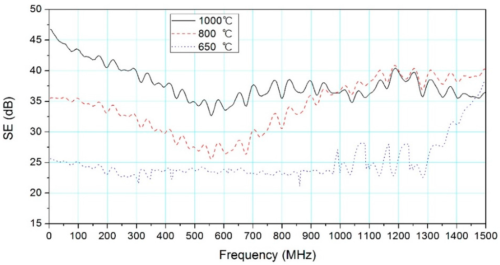 The range of SEs (650 °C) is mostly around 25 dB. SE increased rapidly with frequencies above 1.3 GHz. When the frequencies were over 1.35 GHz, SEs were greater than 30 dB.