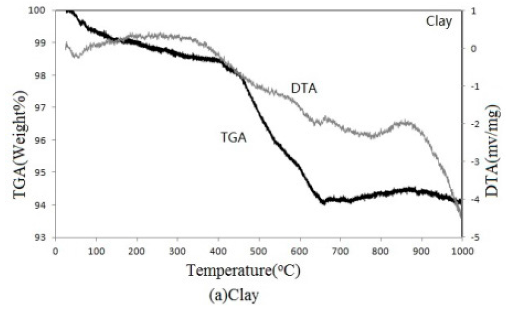 The clay used in this study was a gray-white powder with a specific gravity of 2.33. Its chemical compositions were O (45.02%), Si (23.52%), Al (14.11%), K (7.52%), and Ca (4.77%). The compositions were determined by energy dispersive X-ray analysis (EDXA) (Oxford’s Instrument, Abingdon, UK), which detects unique sets of peaks with different atomic structures on a sample’s X-ray emission spectrum.