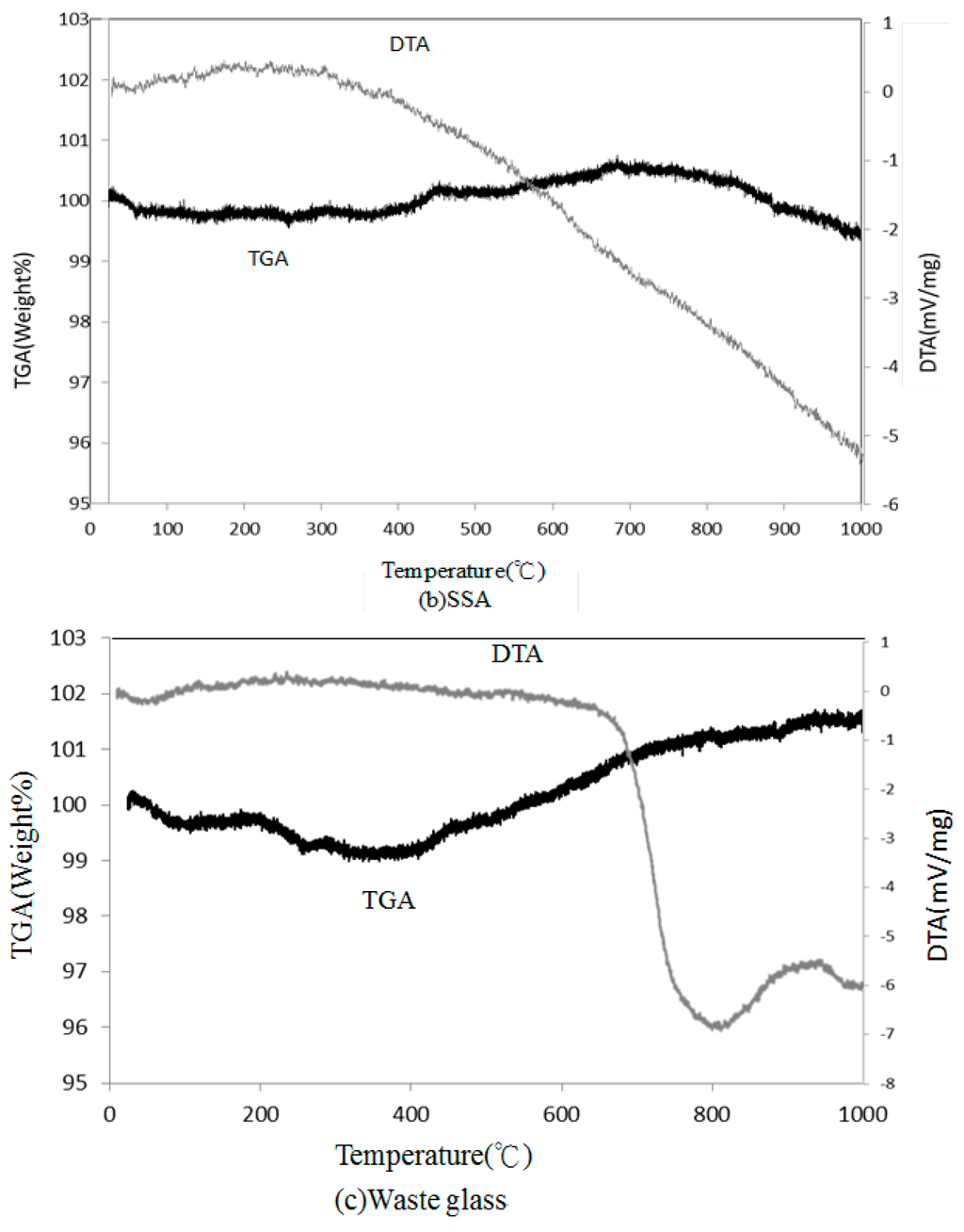 The sewage sludge cakes were acquired from the Kaohsiung City wastewater treatment plant with a specific gravity of 2.33 and moisture content of 75%. These cakes were naturally dried for 1 to 2 days before initially incinerated in a kiln at 800 °C for 20 h. After kiln incineration, the cakes were ground into a powder to pass through #200 sieves by a multi-spinning powder-grinding machine. The chemical compositions of sewage sludge ash (SSA) were then analyzed with EDXA; the SSA was found to include O (50.34%), Si (37.86%), Ca (2.66%), Fe (2.95%), and Al (2.38%), as well as slight amounts of Mg, K, Cr, and Zn. Waste glass sample used in this study was acquired from a recycling company near Kaohsiung City and had a specific gravity of 2.39. The chemical compositions of the waste glass sample were found to be O (46.87%), Si (28.44%), Na (7.85%), and Ca (7.12%), and trace amounts of Mg, Al, and C were detected.