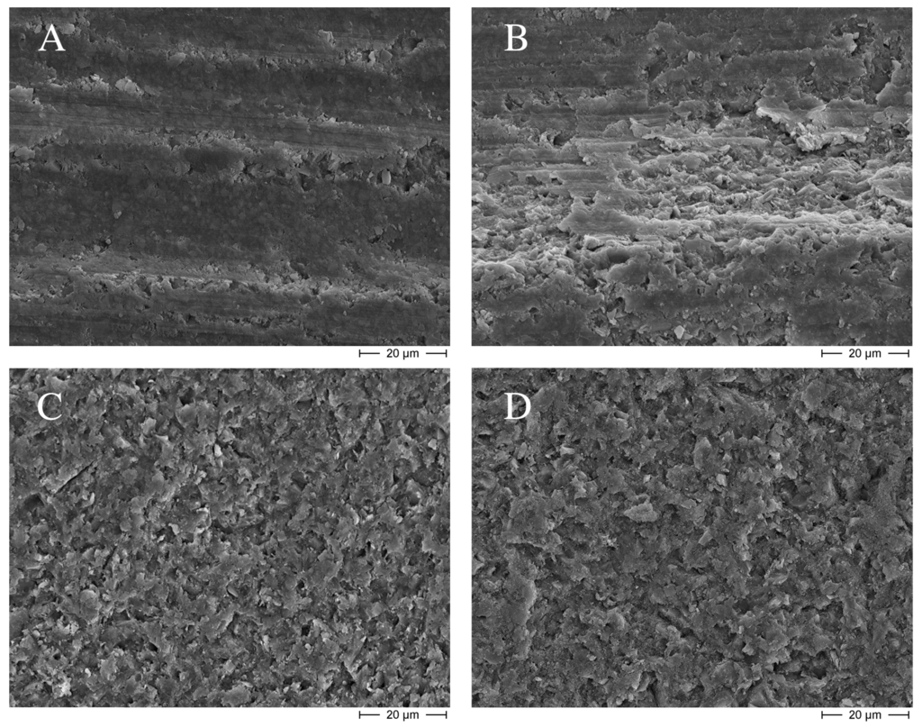 Scanning electron micrographs of the different surface treatments: (A) Negative reference, red code diamond bur; (B) Group 3, blue code diamond bur; (C) Group 4, sandblasting with Al2O3 particles; and (D) Group 6, sandblasting with CoJet Sand. Etching with phosphoric acid (Group 2) did not affect the microscopic appearance of the surfaces, which looked similar to those of the negative reference (A) and were therefore not presented here.