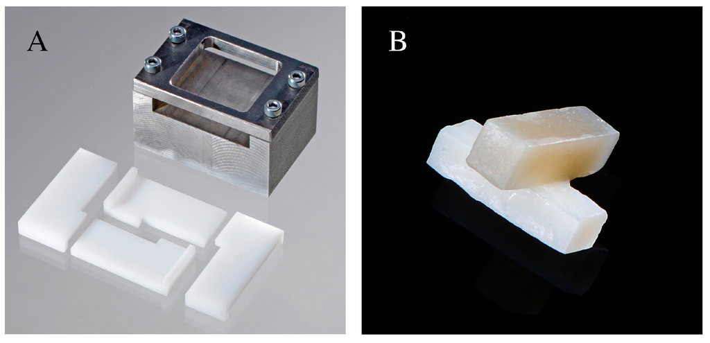 (A) Polyacetal Delrin molds used to produce the composite samples; (B) Bonded specimens.