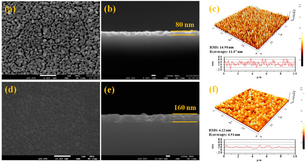SEM and AFM images of VO2 (a–c) and SiO2/VO2 (d–f) thin films. The average roughness of the samples was (c): 11.87 nm and (f): 4.91 nm.