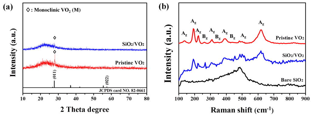 X-ray diffraction (XRD) (a) and Raman spectra (b) of VO2 and SiO2/VO2 thin films.