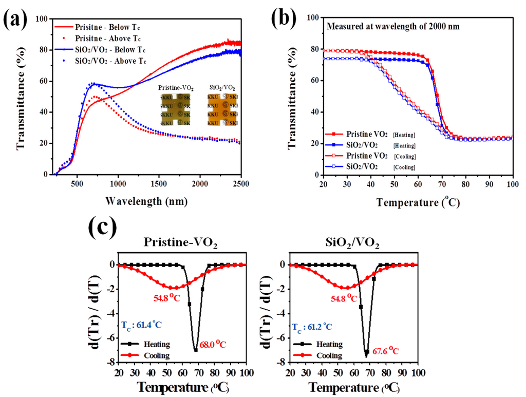 Transmittance spectra (a); hysteresis loops at 2000 nm (b) as well as corresponding d(Tr)/d(T)&T curve (c) for pristine VO2 and SiO2/VO2 thin films. The inset images in (a) correspond respectively to photographs of the pristine VO2 film (left) and VO2/SiO2 film (right). In (a), solid line measured at 25 °C, dashed line at 100 °C.