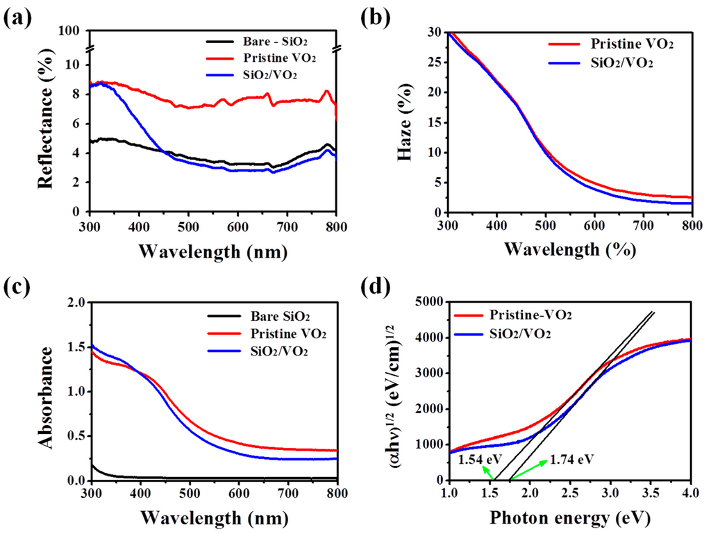linear extrapolation of (αhν)1/2 vs. hν near the band gap provided Eg as the intercept at the α = 0 axis. The optical band gap for the pristine VO2 thin film increased from 1.54 to 1.74 eV after SiO2 coating. This widening of the optical band gap induces a blue shift and an enhanced visible transmittance [15]. This means that the enhancement of Tvis for SiO2/VO2 corresponds to the decrease in absorbance and reflectance including the formation of denser and smoother surfaces on the films.