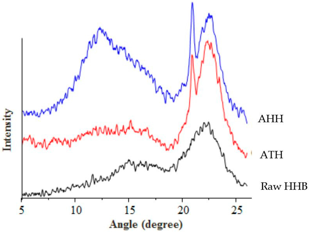 Due to the alkaline treatment, hemp exhibited polymorphs I and II of cellulose with increased intensity [38]. An increase in the crystallographic plane and a decrease in the amorphous region can be observed after alkaline treatment. The crystallinity index of hemp increased from 39% to 52% after alkali purification. These results supported the data obtained from FTIR suggesting an effective treatment, which destroyed the strong cross-linked structure of biomass.