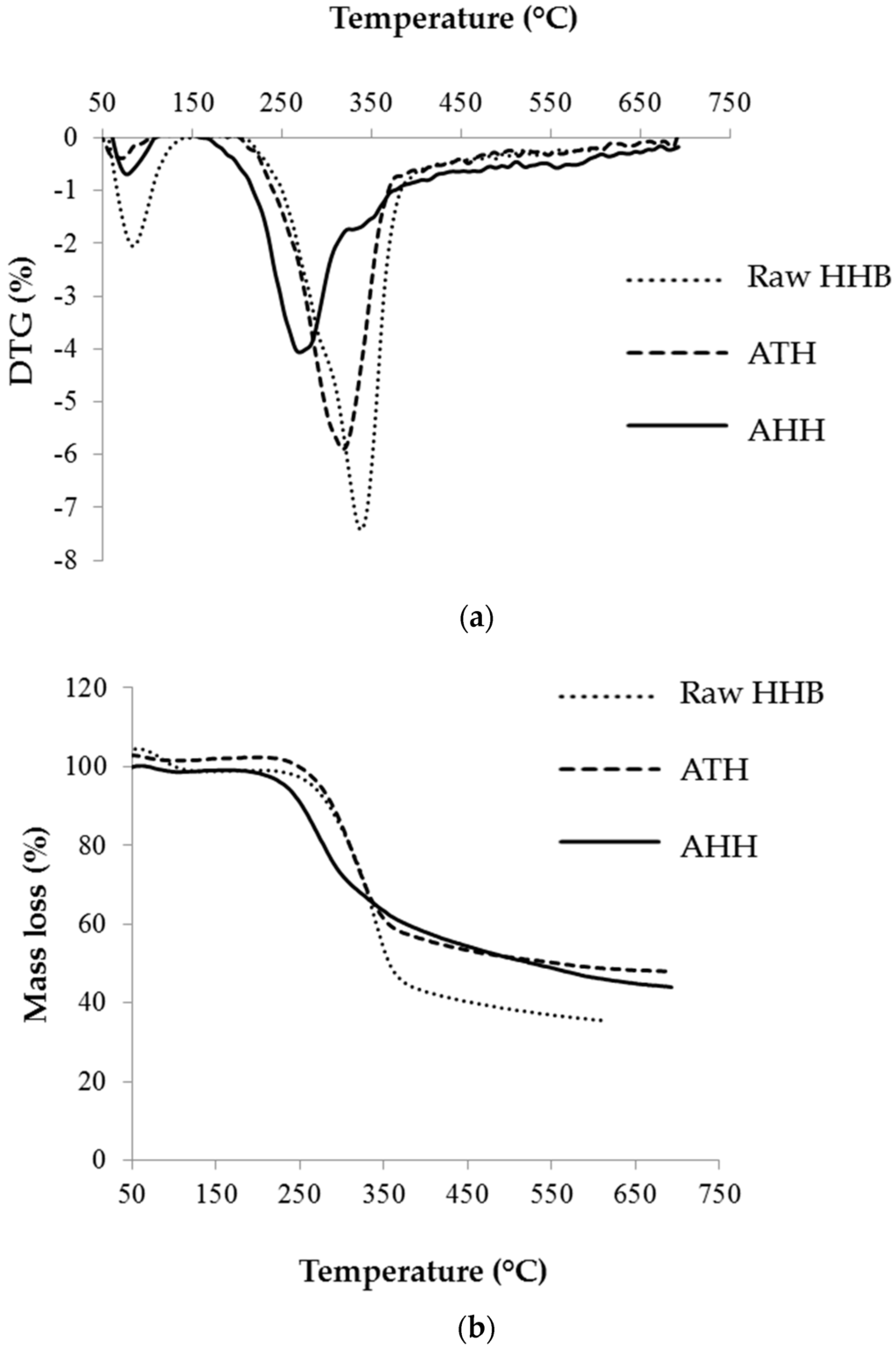 Thermal degradation of raw and treated HHB. (a) DTG and (b) TG curve.