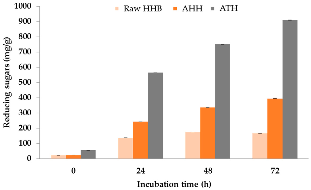 Enzyme saccharification of raw, AHH and ATH for 72 h using cellulase from Trichoderma reesei.