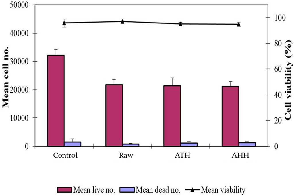 The cellulose microfibres produced by the two different methods, alkaline and acid hydrolysis, were assessed for biocompatibility using human fibroblasts. As shown in Figure 6, there was no difference in cell proliferation (human fibroblasts) between the raw HHB and the treated samples (ATH and AHH). Cell viability greater than 90% was observed across all of the groups indicating that the two extraction methods used to produce cellulose microfibres were not toxic to cells. The excellent biocompatibility of these cellulose extracts lends themselves to be used as biomaterials. Previous studies have demonstrated that various types of cells such as fibroblasts, smooth muscle cells, glioma cells and mesenchymal stem cells attached and proliferated better on micro- and nanostructured surfaces than flat surfaces [45,46]. Studies have demonstrated the usage of cellulose microfibres for tissue engineering, which included tendon/ligament preparation and drug delivery aspect [47]. The ability to use wood waste to produce cost effective nanostuctured natural biomaterials has the potential of generating interest in using cellulosic nanofibres in biomedical applications. Results from this study demonstrated that the bioprocessing method can produce cellulose microfibres that has excellent compatibility, expanding its use to biomedical applications, for example, tissue engineering.