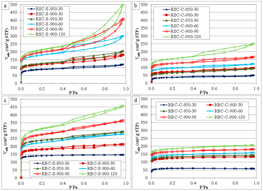According to the IUPAC classification, the HCl-washed ACs produced from RSC (Figure 1a,b) showed type IV adsorption isotherms [28,29]. The steep initial part of the isotherm (p/p0 < 0.05) was assigned to micropore filling, indicating a considerable degree of microporosity (pore widths < 2 nm). The second part of the isotherm (p/p0 > 0.4) consisted of two separated branches, indicating hysteresis and associated capillary condensation in mesopores (pore widths: 2–50 nm). The hysteresis loops were classified as type H4, resembling those of microporous adsorbents with narrow slit-shaped pores [29]. These loops became more pronounced for more severe activation conditions. The ACs produced from RBC using steam activation (Figure 1c) had type IV adsorption isotherms with type H4 hysteresis loops, except for the sample activated at the lowest temperature (RBC-S-850-30). In contrast, the CO2 activated samples (Figure 1d) showed type I adsorption isotherms, except for the ones produced using longer activation times (RBC-C-900-90 and RBC-C-900-120). These results suggest that the activation agent had a considerable effect on the pore development when RBC was used as the raw material, while this was much less in the case for the HCl-washed ACs produced from RSC.