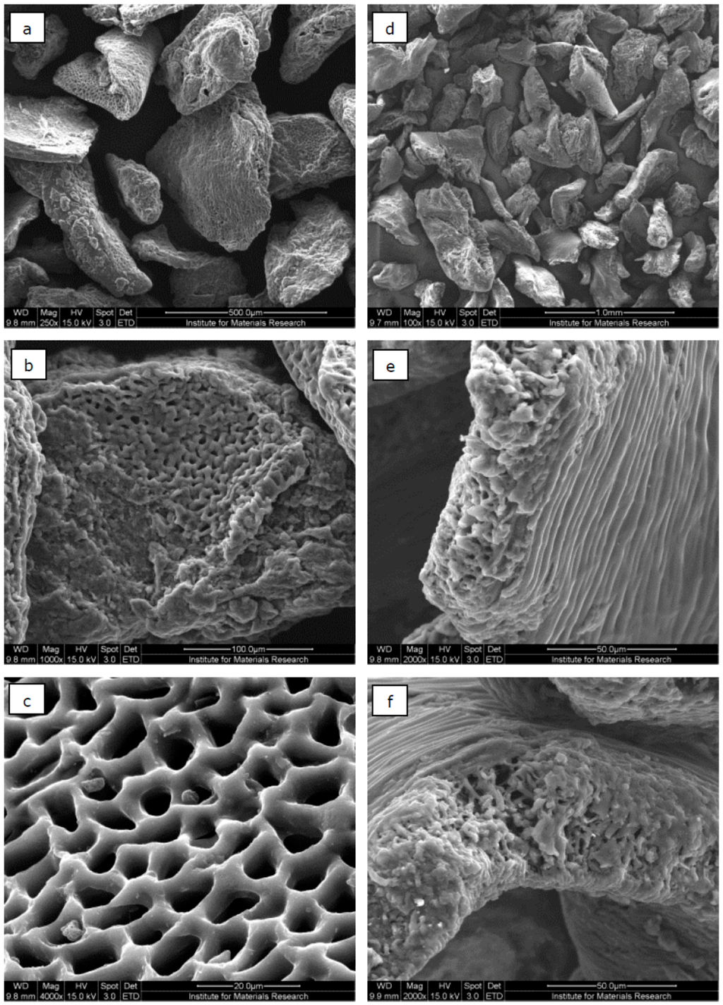SEM images of ACs produced from rapeseed cake (C-900-60) with a magnification factor of 250 (a), 1000 (b) and 4000 (c); and ACs produced from raspberry seed cake (C-950-30) with a magnification factor of 100 (d), 2000 (e) and 4000 (f).