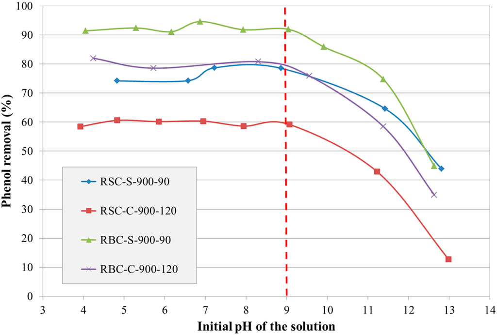 Effect of the initial pH of a solution on the phenol removal by selected ACs derived from RSC and RBC (C0 = 150 mg/L).