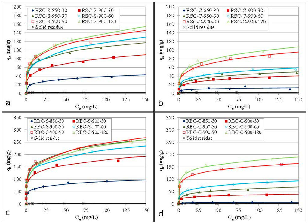 In general, the equilibrium data were best fitted by the Freundlich model, as indicated by the R2 values. Therefore, the ACs were believed to contain some heterogeneity on the surfaces and/or pores participating in phenol adsorption. The Freundlich constant (KF) increased with higher activation temperatures and longer activation times (except for RBC-S-900-120). The 1/nF parameter had values less than unity for all samples, indicating that phenol adsorption was a favorable process [20]. For ACs from RBC, the 1/nF parameter increased as a function of activation time for steam activation and as a function of activation temperature for CO2 activation, indicating a decrease of the surface heterogeneity in both cases [31]. In contrast, no systematic trend was found for this parameter for the HCl-washed ACs derived from RSC. The Langmuir model fitted the experimental data less well, but could still provide valuable information. In general, more severe activation conditions significantly increased the monolayer adsorption capacity (qm). The HCl-washed ACs from RSC performed not as well as commercial AC, regardless of the activation conditions. In contrast, ACs from RBC showed better adsorption parameters than the commercial AC for longer activation times and higher activation temperatures. Based on these results, the textural characteristics (Table 2) and the total AC yield (Table 1), steam activation at 900 °C for 90 min and CO2 activation at 900 °C for 120 min were selected as the best activation conditions for both raw materials.