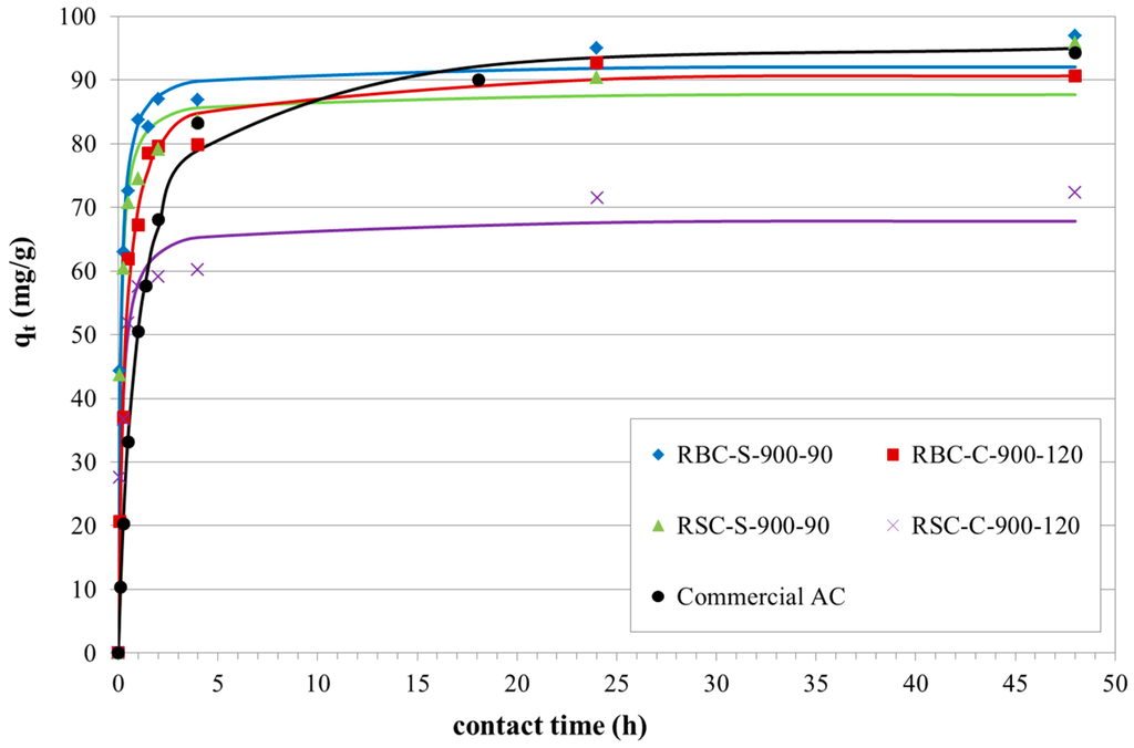Kinetic parameters provide important information on the designing and modeling of the adsorption process [20]. Therefore, selected ACs were investigated by a kinetic study. Experimental data were modeled using the pseudo-first order and the pseudo-second order model (Table 5).