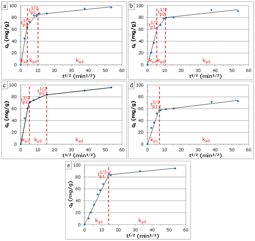 The intraparticle diffusion (IPD) model, presented by Weber and Morris [34], was applied on the kinetic data to study the diffusion mechanism. This empirically-found model assumes that the phenol uptake varies almost proportionally with the square root of time (t1/2), as shown by Equation (5):