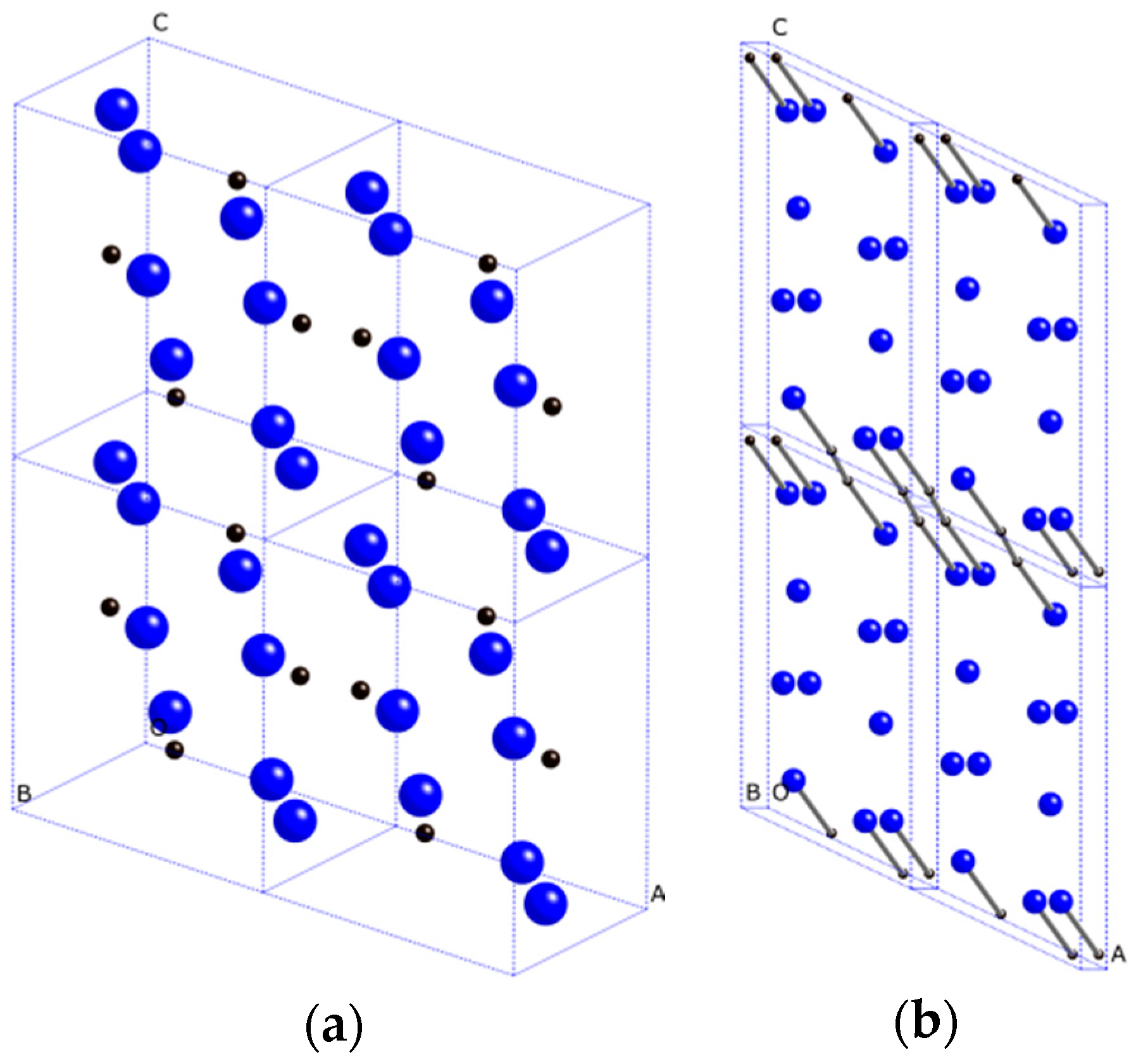 Crystal structures of Ca2C. (a) Pnma-Ca2C; (b) C2/m-Ca2C. The black and blue spheres represent C and Ca atoms, respectively.