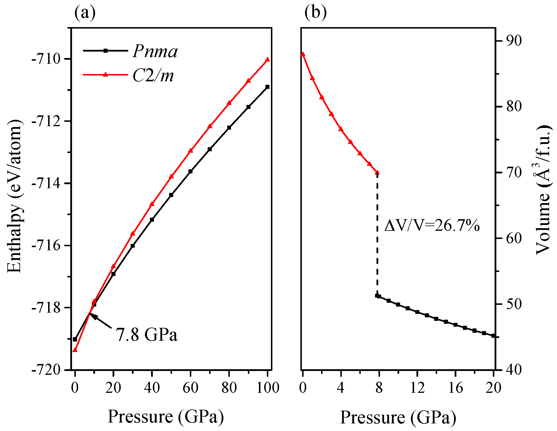Enthalpy (a) and volume (b) as a function of pressure. The black and red solid lines represent Pnma-Ca2C and C2/m-Ca2C, respectively.