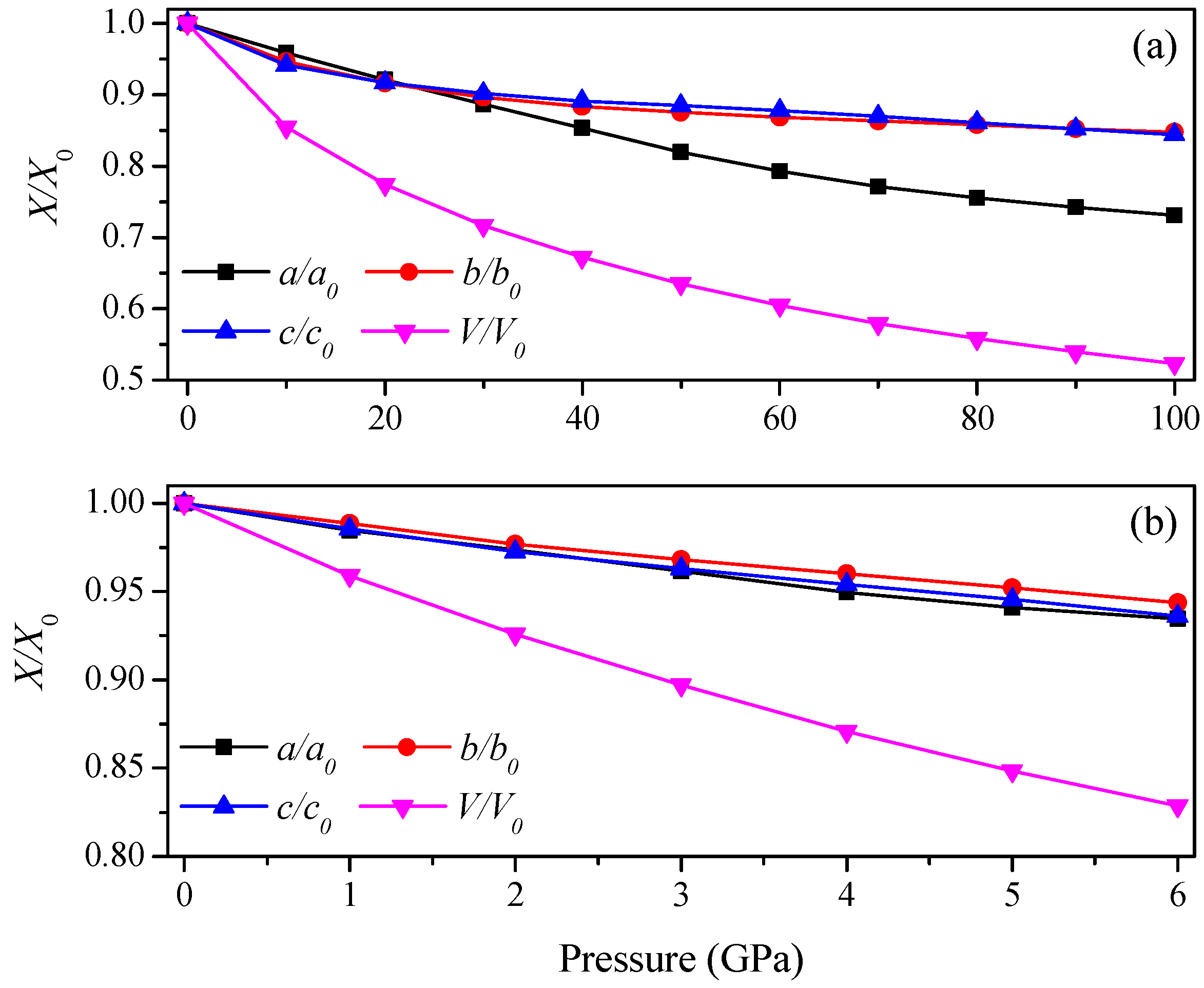 Lattice parameters X/X0 as a function of pressure. (a) Pnma-Ca2C; (b) C2/m-Ca2C.