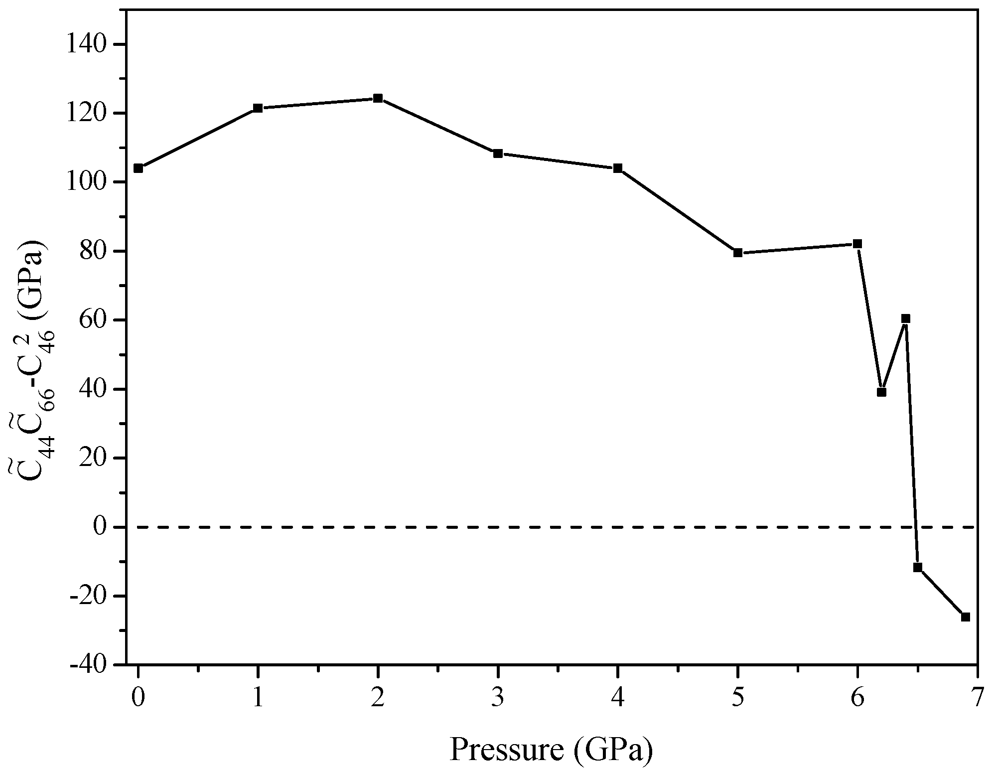 The calculated elastic constants and moduli of Ca2C at 0 GPa and high pressures are shown in Table 3. The strain-stress method was used to calculate the single crystal elastic constants. A small finite strain was applied on the optimized structure and the atomic position was fully optimized. Then, the elastic constants were obtained from the stress of the strained structure. The generalized Born’s mechanical stability criteria of orthorhombic phase at 0 GPa are given by [17,18]: