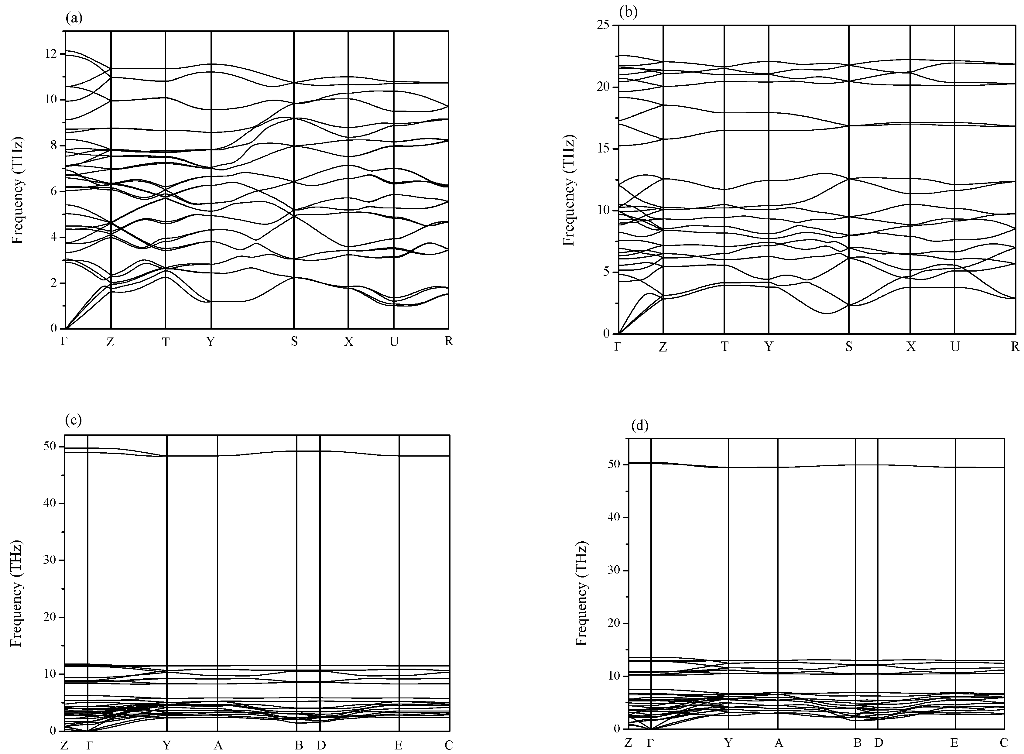 Phonon spectra for (a) Pnma-Ca2C at 0 GPa; (b) Pnma-Ca2C at 100 GPa; (c) C2/m-Ca2C at 0 GPa; (d) C2/m-Ca2C at 6.4 GPa.