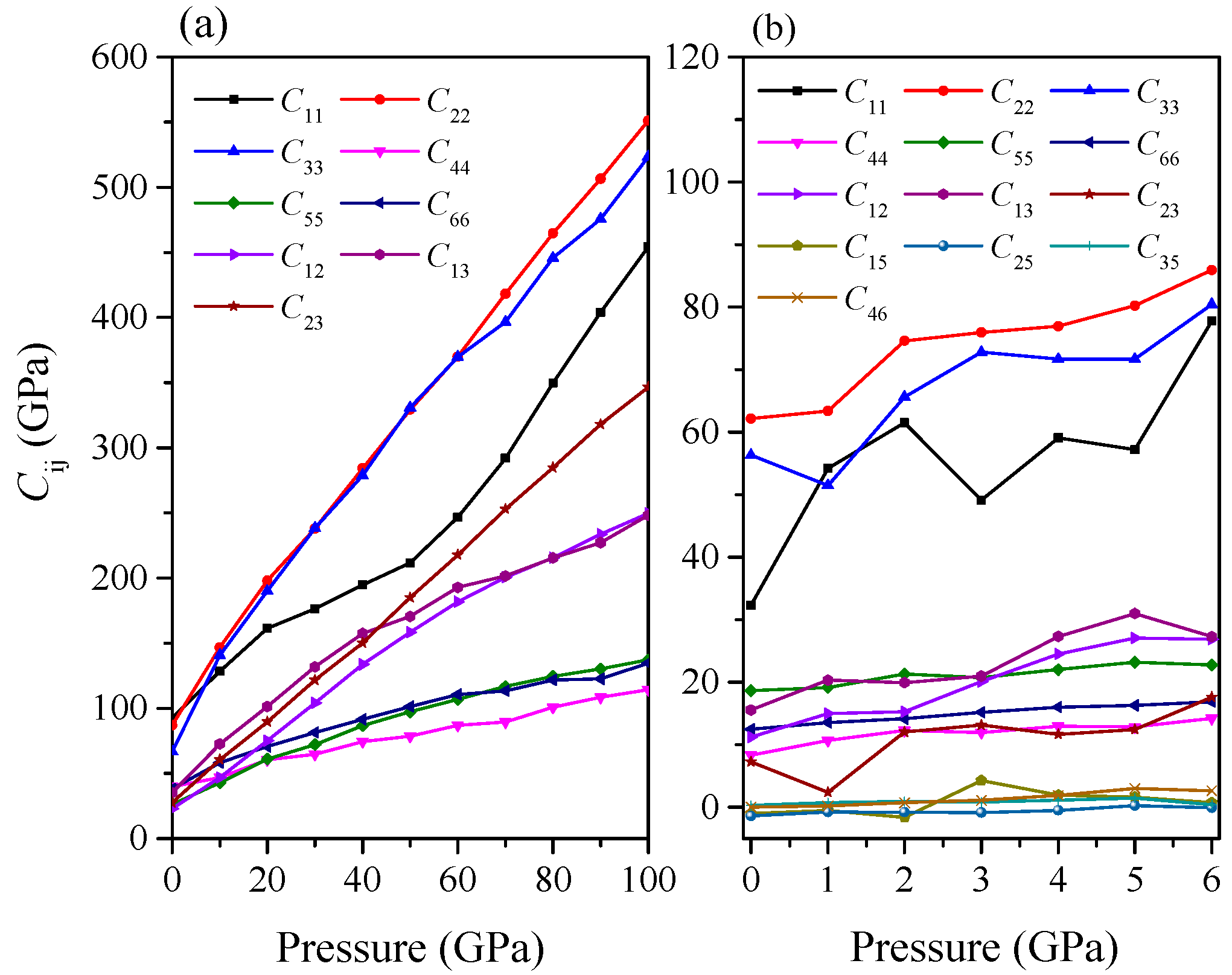 Elastic constants as a function of pressure. (a) Pnma-Ca2C; (b) C2/m-Ca2C.