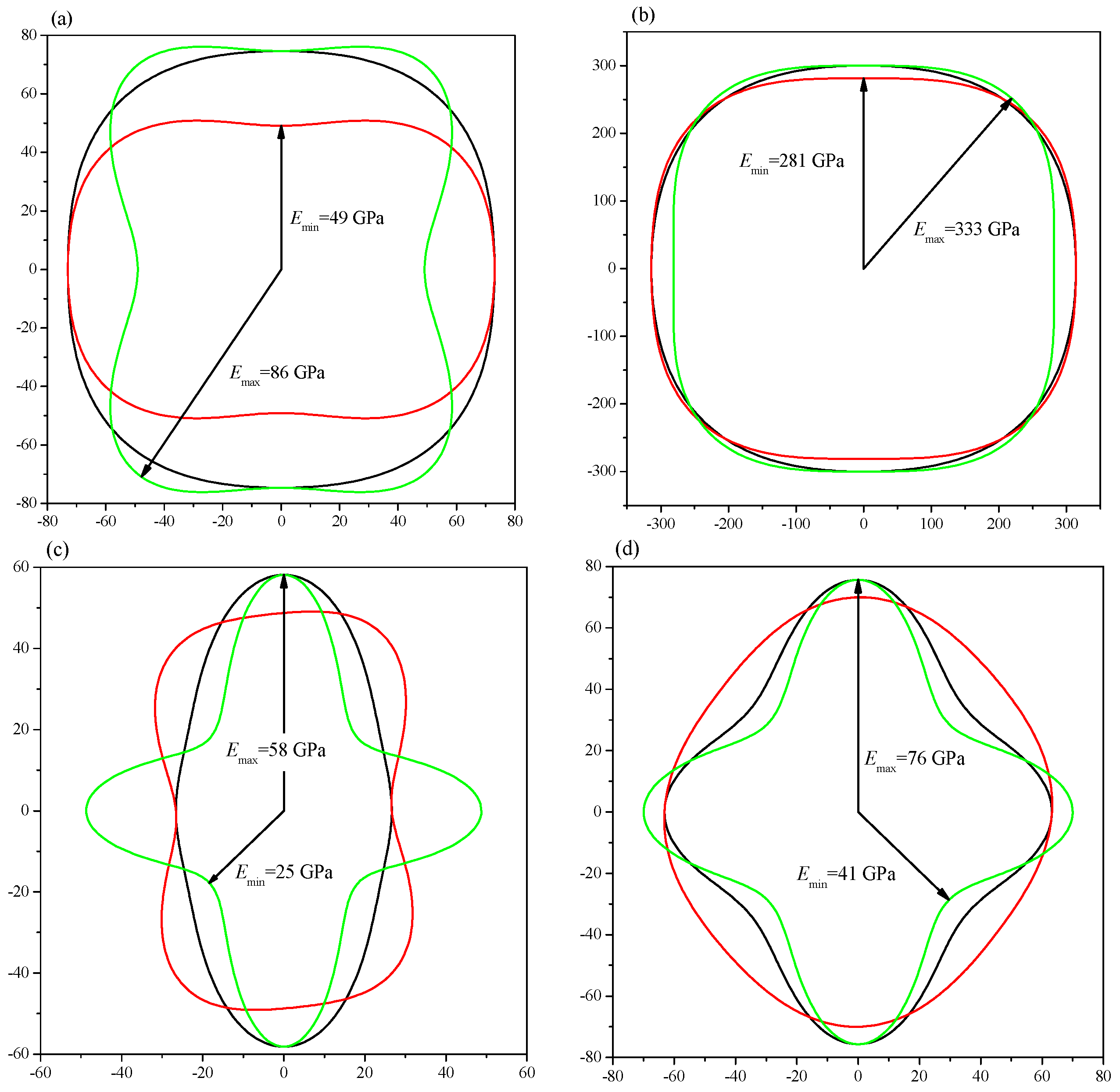 2D representations of the Young’s modulus. (a) Pnma-Ca2C at 0 GPa; (b) Pnma-Ca2C at 100 GPa; (c) C2/m-Ca2C at 0 and 6 GPa; (d) C2/m-Ca2C at 6 GPa. The black, red and green lines represent the xy, xz and yz planes, respectively.