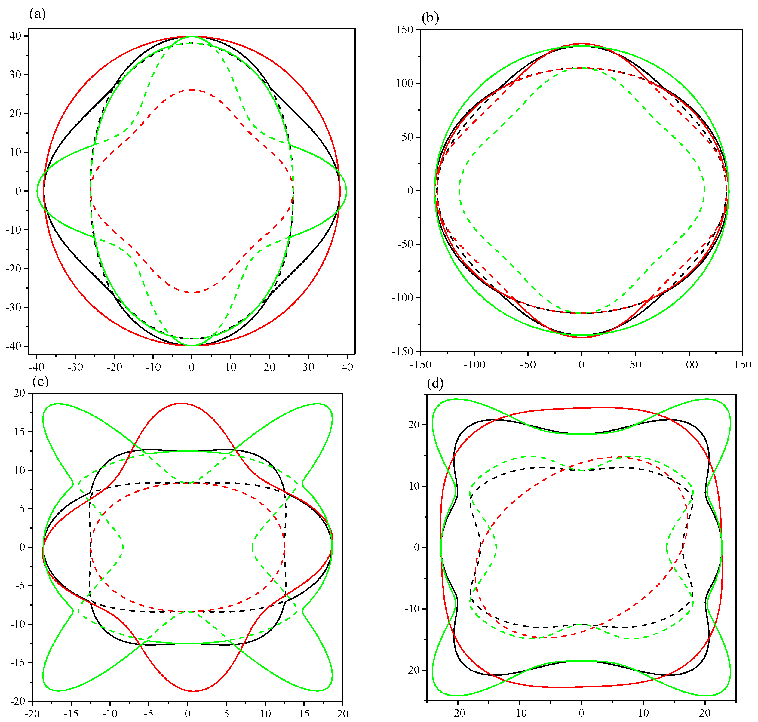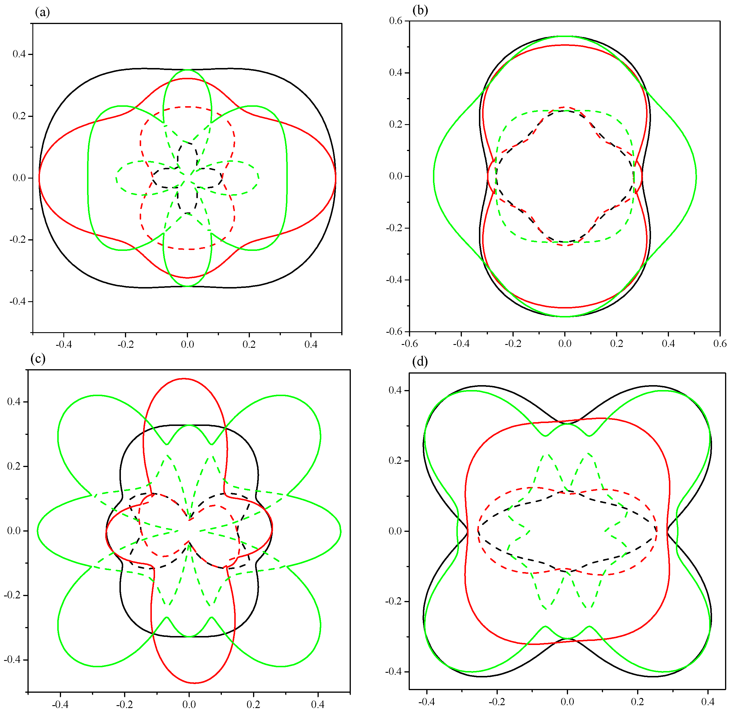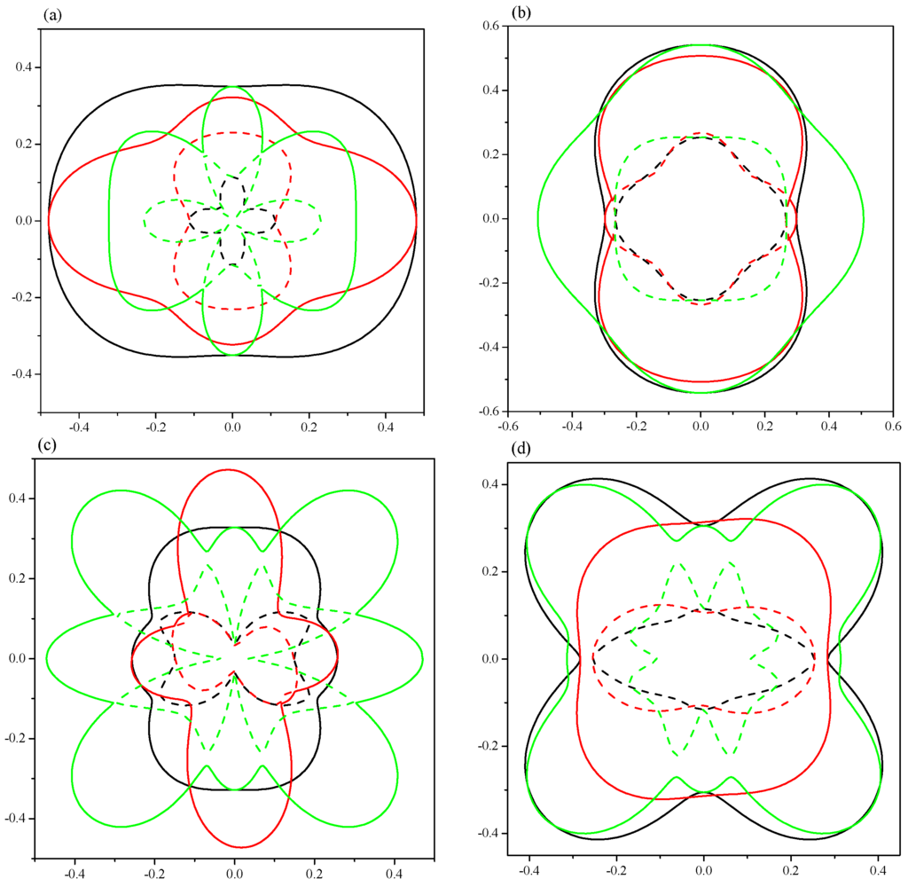 2D representations of shear modulus. (a) Pnma-Ca2C at 0 GPa; (b) Pnma-Ca2C at 100 GPa; (c) C2/m-Ca2C at 0 GPa; (d) C2/m-Ca2C at 6 GPa. The solid and dash lines represent the maximal and minimal positive values, respectively. The black, red and green lines represent the xy, xz and yz planes, respectively.