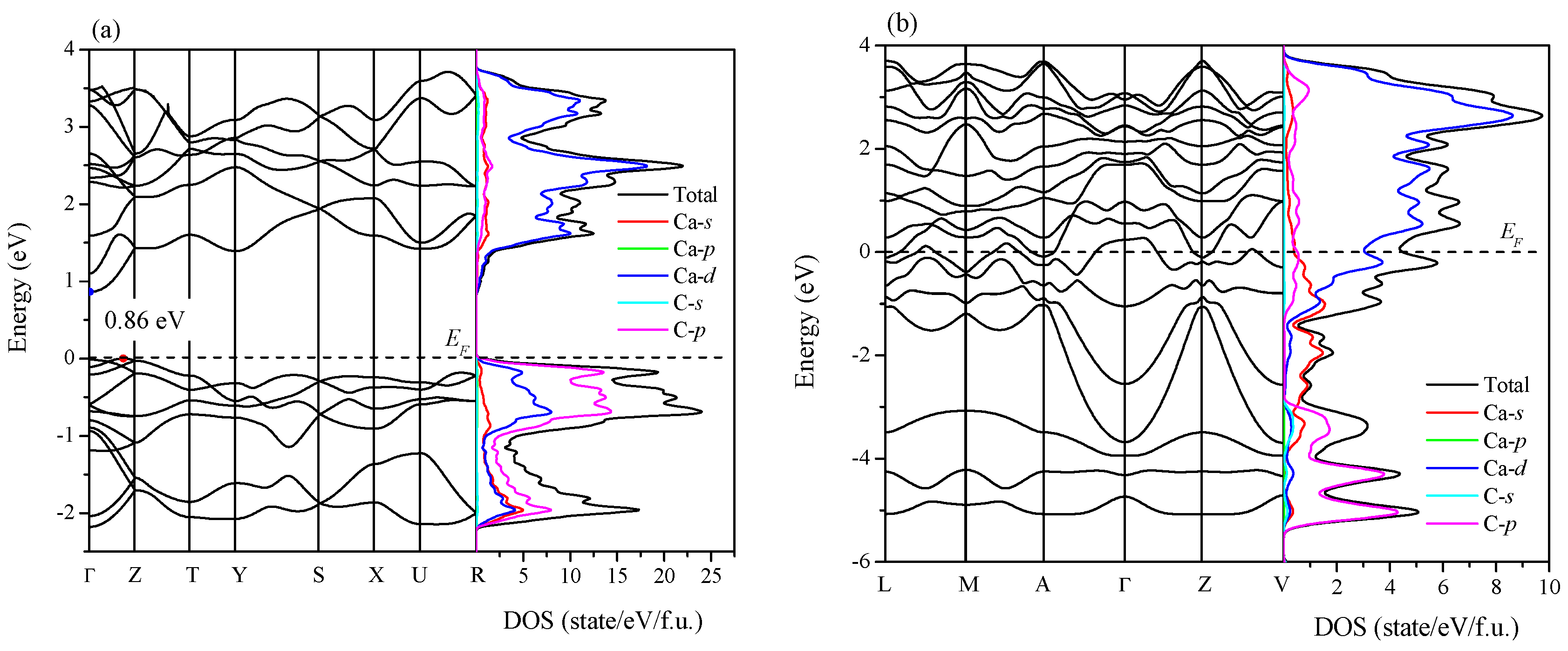 As shown in Figure 10, a research of the electronic band structure and density of state (DOS) of Ca2C at 0 GPa was also made. The dashed line represents the Fermi level (EF). From Figure 10a, one can see that Pnma-Ca2C is a semiconductor characterized by a quasi-direct band gap of 0.86 eV (the direct band gap at Γ point is 0.87 eV). The conduction band minimum (CBM) is just at Γ point, and the valence band maximum (VBM) locates at (0, 0, 0.378) along the Γ-Z direction. The calculated band gap of Pnma-Ca2C at 14 GPa is direct band gap with 0.65 eV, which is close to the previous value of 0.64 eV [9]. It is known that the calculated band gap with DFT is usually underestimated by 30%–50%, so the ideal band gap is larger than this calculated result. The DOS of Pnma-Ca2C near Fermi level is mainly originated from the contributions of C-p orbital electrons. In Figure 10b, the calculated electronic band structure crosses the Fermi level along many directions in the Brillouin zone, showing the metallic character. And the DOS near Fermi level is mainly characterized by the Ca-d orbital electrons.