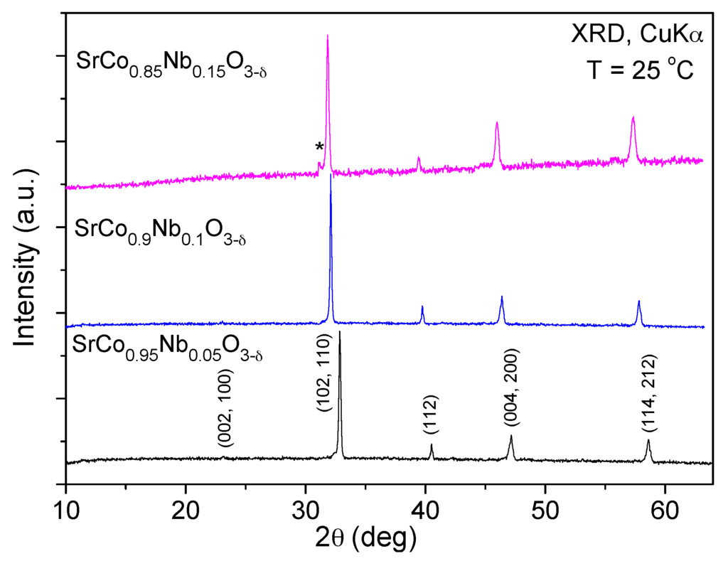 SrCo1−xNbxO3−δ oxides were obtained as well crystallized perovskite phases; Figure 1 shows the XRD patterns at room temperature for SrCo1−xNbxO3−δ (x = 0.05, 0.10, and 0.15), which are indexed on the basis of a tetragonal perovskite unit cell with a = b~ao, c~2ao. The XRD pattern for x = 0.05 has been taken from ref. [18]. The material with x = 0.15 was obtained with a small impurity of the hexagonal phase as shown in Figure 1, with an asterisk for the most intense reflection.