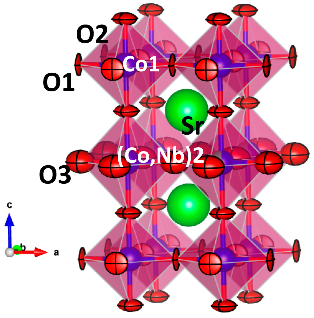 The crystal structure of SrCo0.9Nb0.1O3−δ at room temperature is shown in Figure 3. It is a tetragonal perovskite superstructure consisting of two cubic aristotypes stacked along the c direction. As mentioned, Nb atoms are randomly distributed at Co2 positions, whereas Co1 sites do not apparently contain Nb. This superstructure probably arises from the long-range ordering of oxygen vacancies, since they are all concentrated at the O3 position. Both O1 and O2 oxygen sites are stoichiometric within the standard deviations. The oxygen vacancies belong, therefore, to the coordination polyhedron of (Co,Nb)2. It is noteworthy that (Co,Nb)2O6 octahedra are significantly elongated, with four equatorial (Co,Nb)2-O3 bond lengths of 1.92964(3) Å and two particularly long axial (Co,Nb)2-O2 distances of 2.032(4) Å. Correspondingly, the Co1 octahedra are flattened along the c axial direction, displaying extremely short Co1-O2 distances of 1.840(4) Å. The four equivalent equatorial distances are also 1.92964(3) Å. This long-range arrangement could be the second ingredient of the observed superstructure along the c axis. This phenomenology is reminiscent of that described for SrCo1−xMxO3−δ (M = Ti, V) [23] where these differences in the octahedral size suggested that Co1 cations may present a higher oxidation state than Co2. The average oxidation state for Co is 3.53+ assuming a pentavalent oxidation state for Nb and divalent for Sr. This involves an oxidation state of Co4+ in Co1 sites and Co3+ in (Co,Nb)2 positions, assuming a full charge disproportionation. In fact, the presence of Co3+ with an intermediate-spin in Co2 sites could cause the Jahn-Teller distortion of the Co-O bond lengths, and O2− ions would approach Co4+ cations, moving from Co2 to Co1.