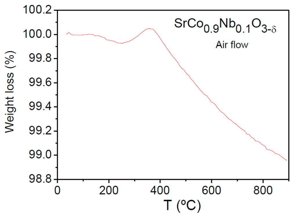 The oxygen content of the samples was determined by thermogravimetric analysis carried out in air from 25 to 900 °C. Figure 4 shows the TGA curves for the SrCo0.9Nb0.1O3−δ perovskite. It shows a minor weight loss up to 300 °C. A conspicuous weight gain is observed between 300 and 400 °C. This was also previously observed in Sb-doped oxides [17] and it could be related to partial Co oxidation with a slight incorporation of oxygen atoms into the unit cell. From 400 °C, there is a regular and important weight loss up to 900 °C of 1.05% corresponding to 0.13 oxygen atoms per formula. This indicates that, at the working conditions of a SOFC, the cathode material is even more oxygen deficient, which undoubtedly improves the O2− motion of this MIEC oxide.