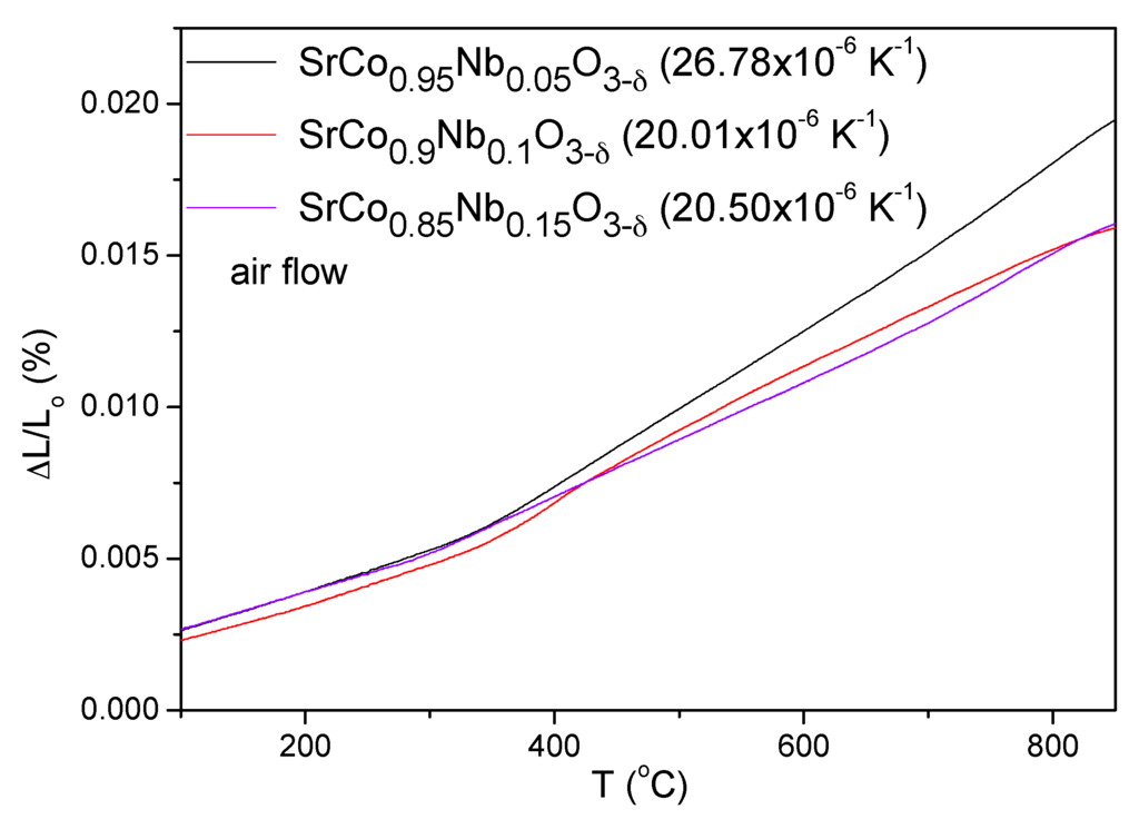 Thermal expansion determined by dilatometry of the SrCo1−xNbxO3−δ (x = 0.05, 0.1, and 0.15) perovskites (data for x = 0.05 are taken from ref. [18], reprinted and adapted from [18], with permission from © 2014 Elsevier).