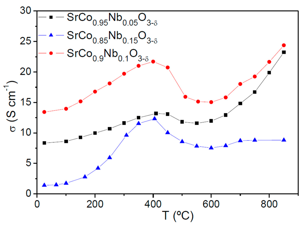 Figure 6 shows the thermal variation of the electrical conductivity of SrCo1−xNbxO3−δ (x = 0.05, 0.10, and 0.15) measured in sintered bars (10 mm large × 3 mm width × 3 mm high) in air atmosphere by the dc four-probe method; the bars were sintered at 1100 °C for 12 h. Data for x = 0.05 are taken from ref. [18]. The three perovskites show a semiconductor-like behavior with an anomaly around 400 °C; this anomaly matches with the oxygen lost, observed in the thermal analysis curve. The maximum conductivity values at 850 °C for SrCo1−xNbxO3−δ (x = 0.05, 0.10 and 0.15) are σ = 46.5, 48.8, and 19.7 S∙cm−1, respectively. There is a clear decrease in the electrical conductivity for x = 0.15 with respect to x = 0.05 and 0.1 which could be related to the observed impurity of the hexagonal phase (Figure 1) and could contribute to hinder the electronic conductivity. The σ values for SrCo0.9Nb0.1O3−δ are comparable to those of the most widely used derivative of SrCoO3−δ, such as Ba0.5Sr0.5Co0.8Fe0.2O3−δ (BSCF) showing σ = 35 S·cm−1 at 850 °C [5,24] and SrCo0.8Fe0.2O3−δ (SCF), chosen for its high oxygen fluxes and favorable performance for oxygen reduction.