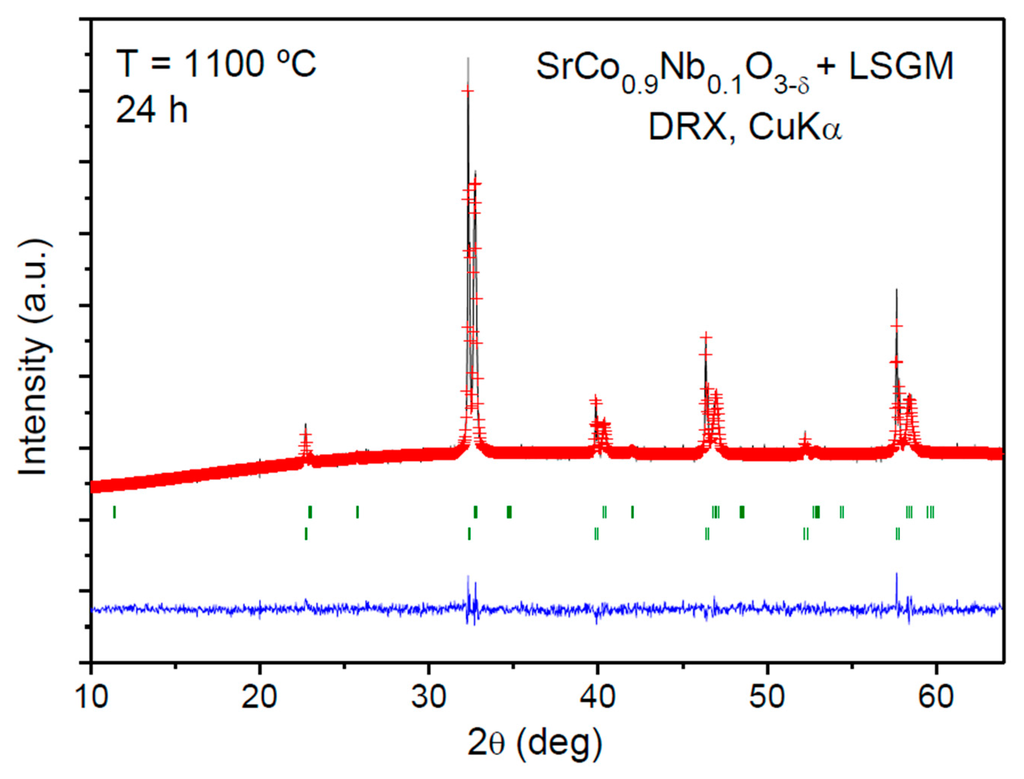 Rietveld-refined XRD profiles of a mixture of SrCo0.9Nb0.1O3−δ and La0.8Sr0.2Ga0.83Mg0.17O3−δ (LSGM) after thermal treatment at 1100 °C for 24 h in air.