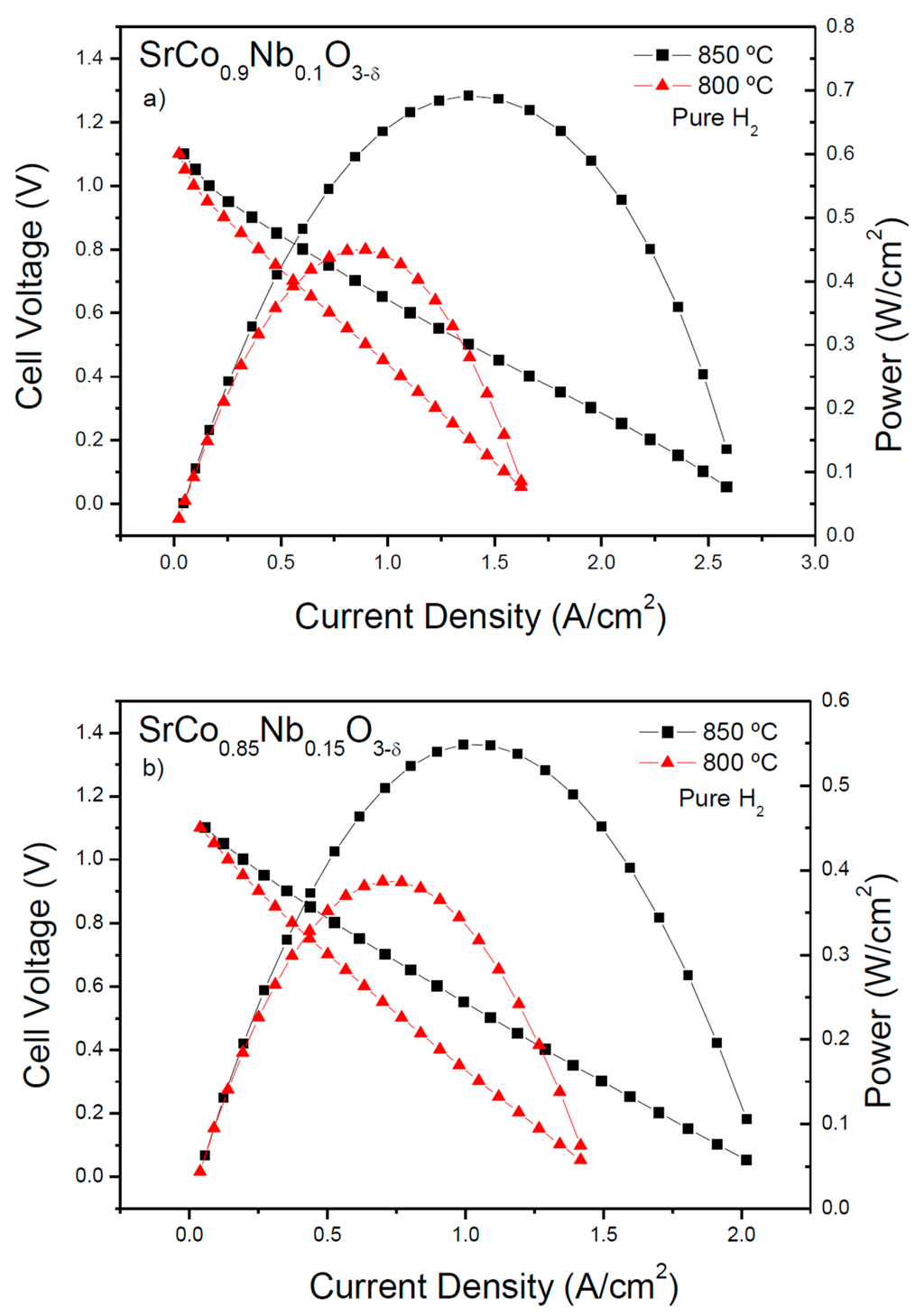 The performance of SrCo1−xNbxO3−δ (x = 0.10 and 0.15) as cathode materials was tested in single cells in an electrolyte-supported configuration using a 300-µm-thick LSGM electrolyte. Figure 8a,b illustrate the cell voltage and power density as a function of the current density at 800 and 850 °C for the test cells fed with pure H2; the cathode materials worked in air atmosphere. The maximum power densities generated by the cells for the SrCo0.90Nb0.1O3−δ and SrCo0.85Nb0.15O3−δ cathodes are 693 and 550 mW∙cm−2 at 850 °C, respectively. If we compare these output powers with that reported for x = 0.05 in ref. [18] (595 mW∙cm−2 at 850 °C), we can appreciate a relationship between the electrical conductivity and the performance of these materials as cathodes.